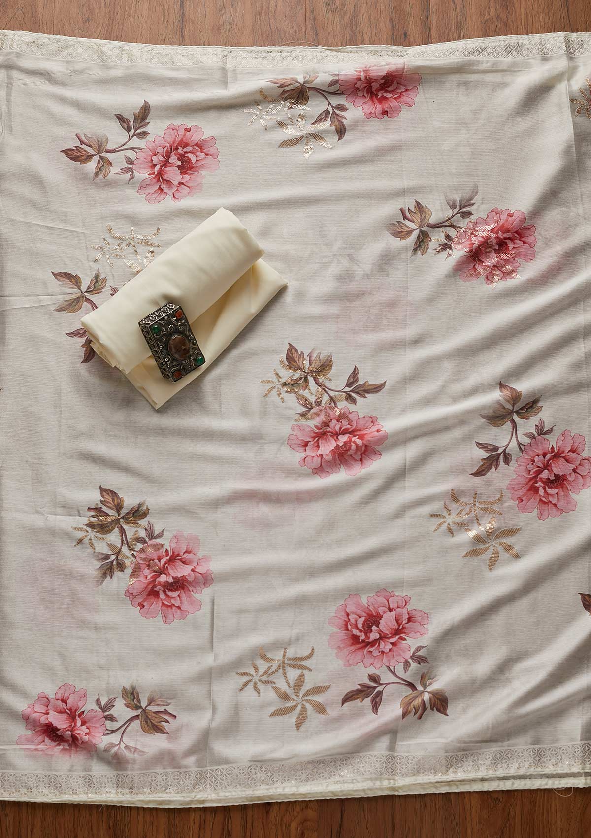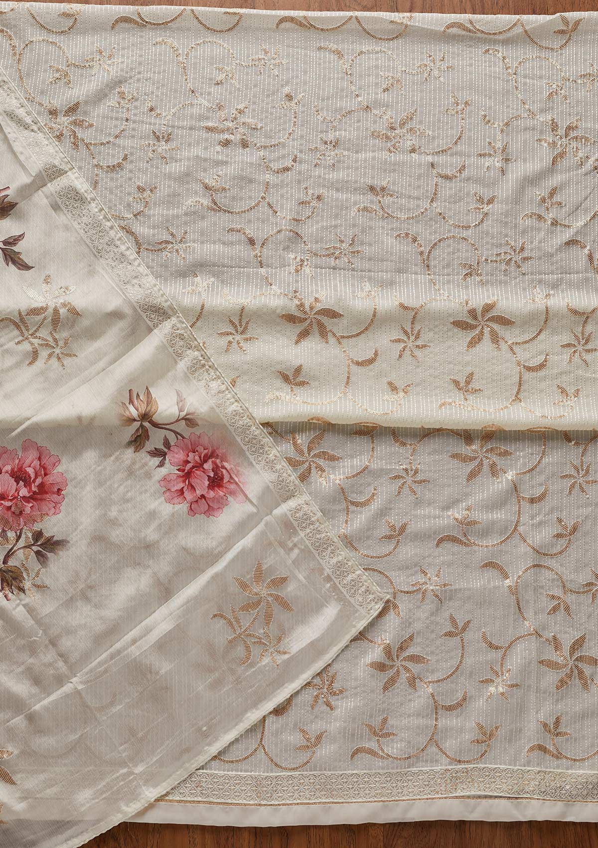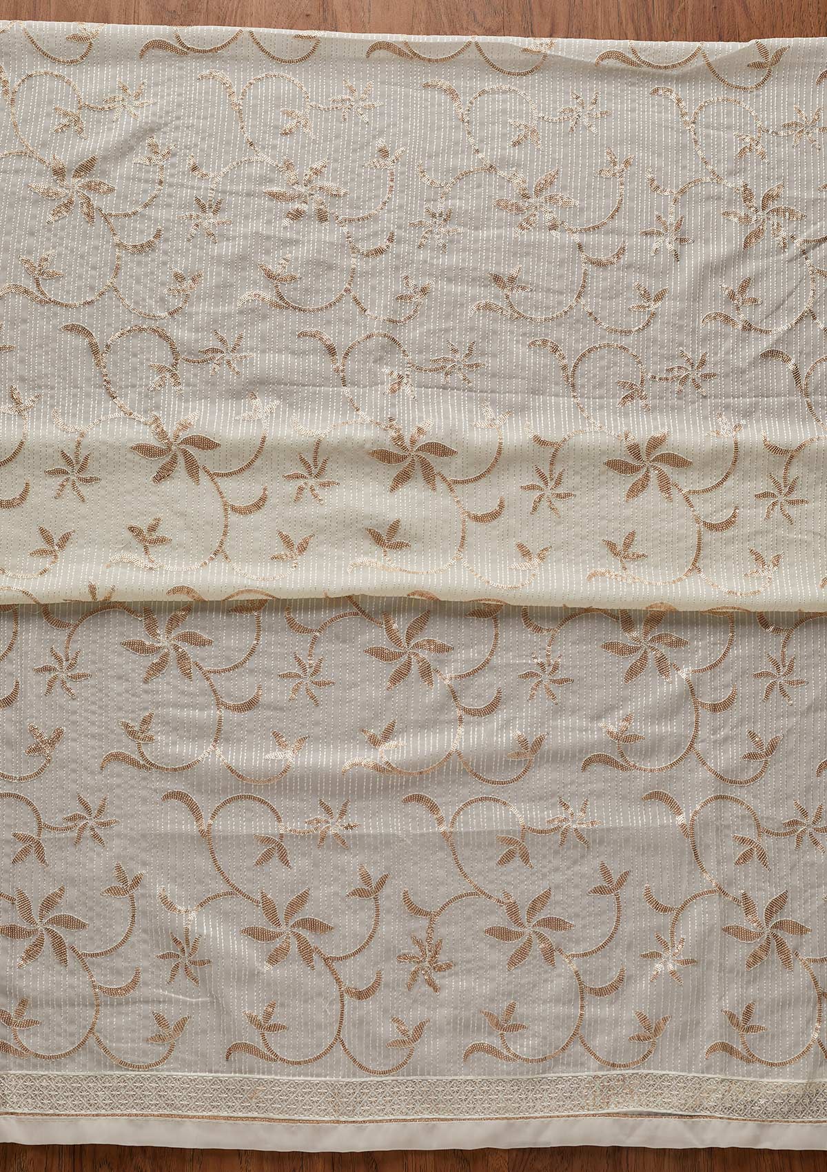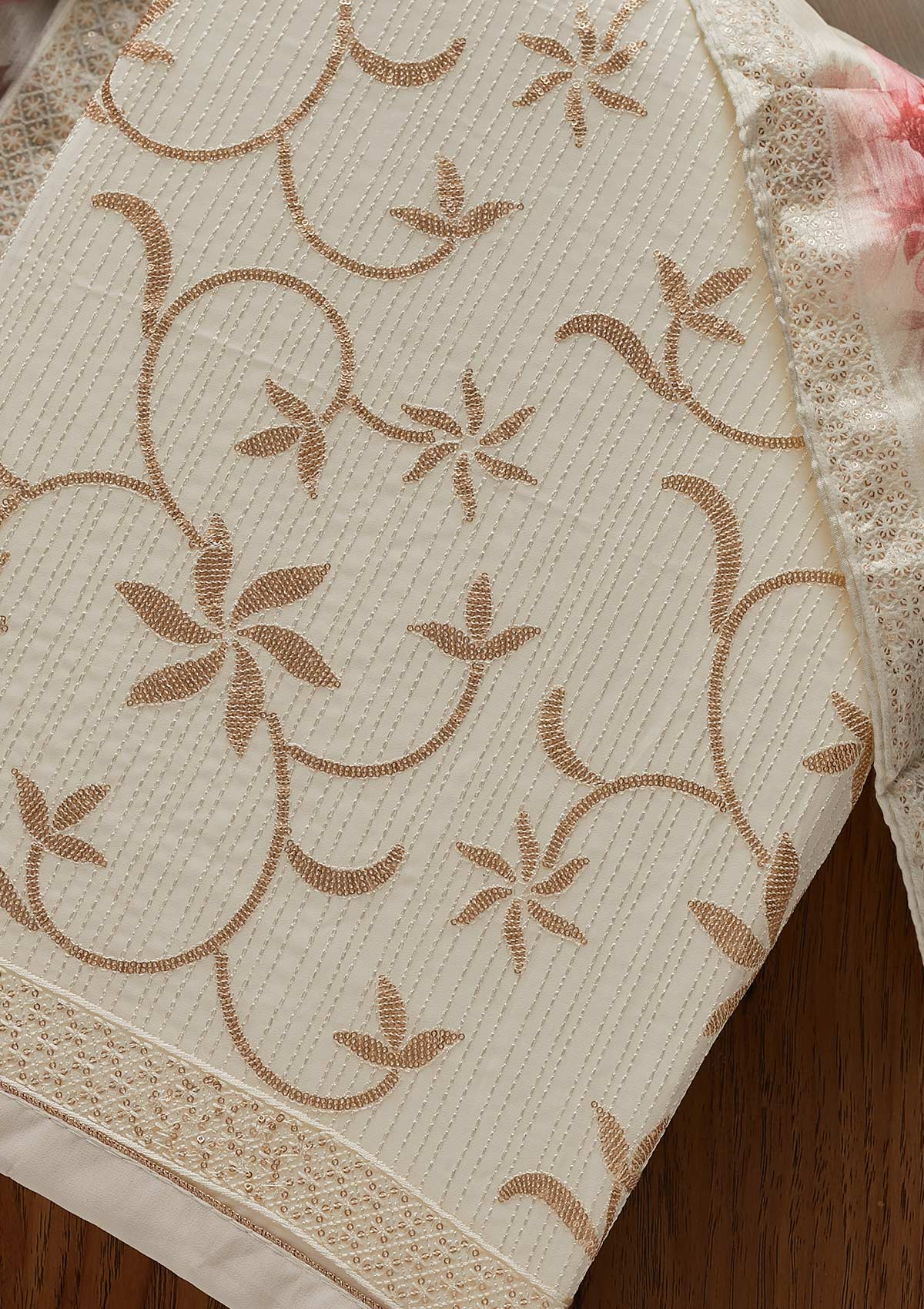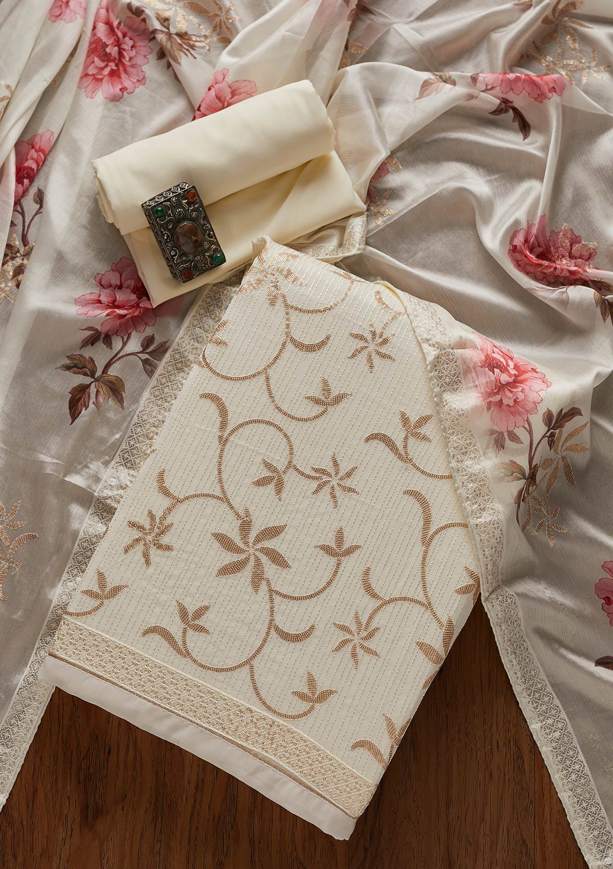 Cream Salwar Suit In Georgette Fabric. The Salwar Suit Is Embellished With Sequins Embroidery. Accompanied with an unstitched bottom and dupatta. Comes With The Koskii Promise Of Premium Quality.