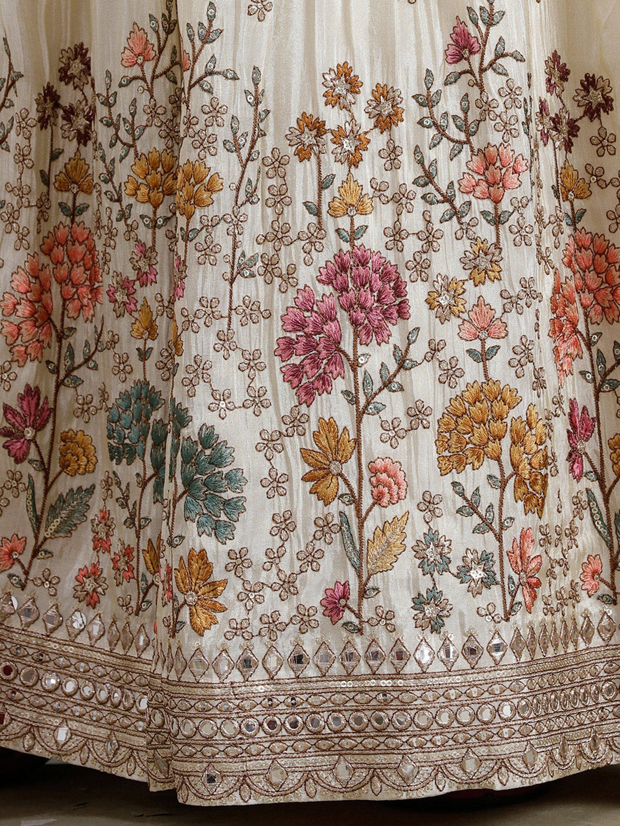 Cream Threadwork Art Silk Readymade Lehenga