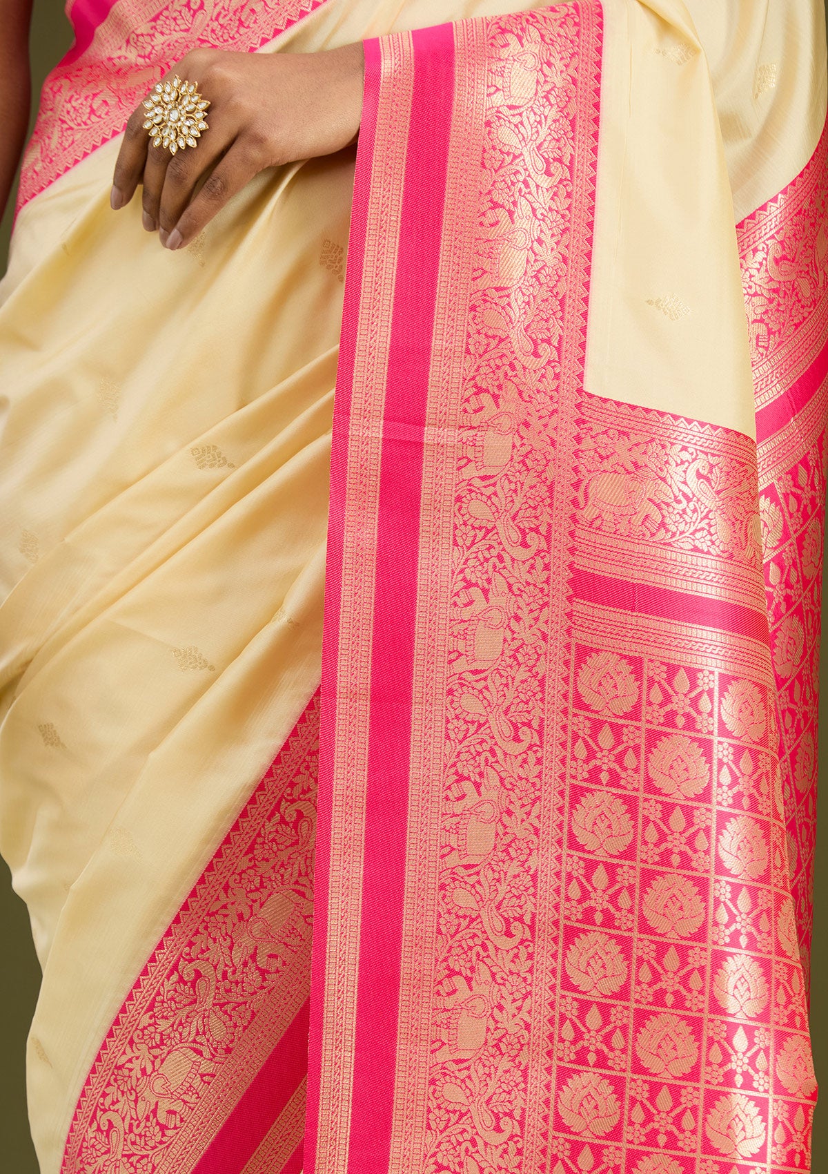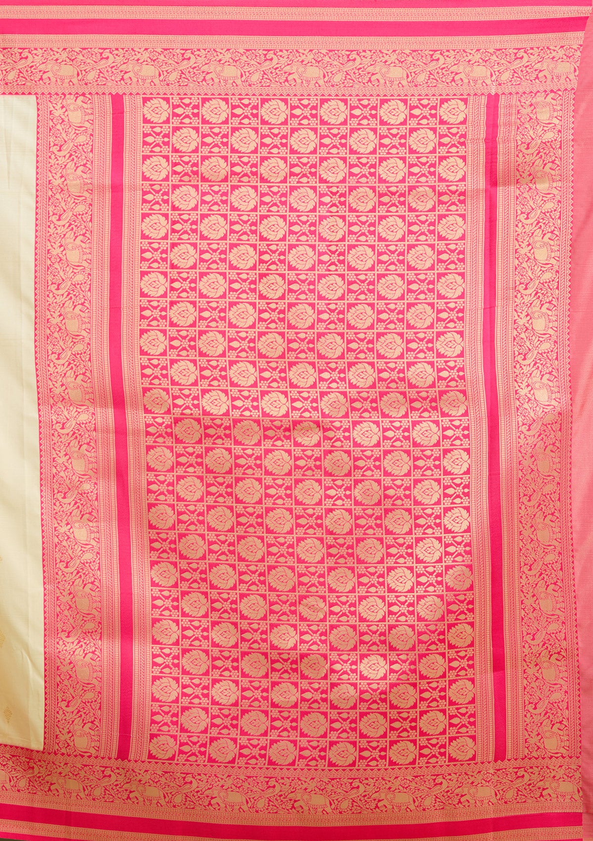Cream Silk_Saree in Silk fabric. The Silk_Saree is elevated with Zariwork (Gold) embroidery. It comes with an Unstitched blouse. Comes with the Koskii promise of premium quality.