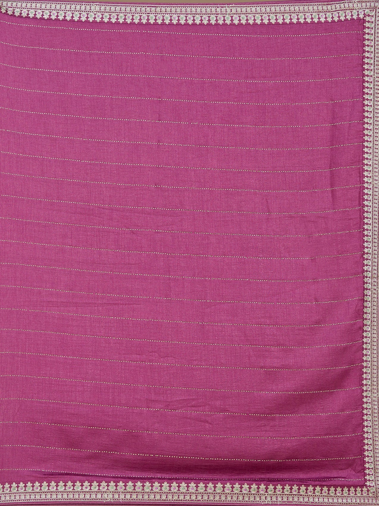 Dark Lavender Saree in Soft Raw Silk fabric The Saree is elevated with Zariwork (Silver) embroidery It comes with an Unstitched blouse Comes with the Koskii promise of premium quality.