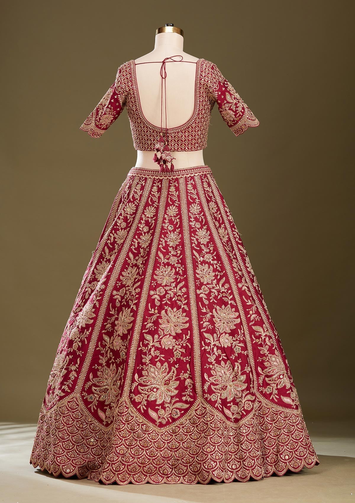 Dark Maroon Readymade Lehenga in Raw Silk fabric. The Lehenga is embellished with Zardozi (Gold) embroidery. Accompanied with an Readymade blouse and dupatta. Comes with the Koskii promise of premium quality.