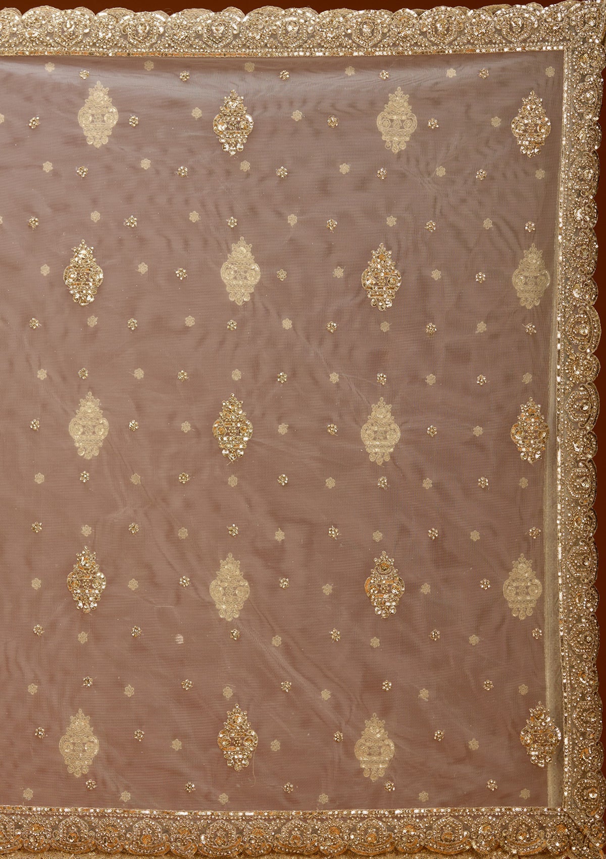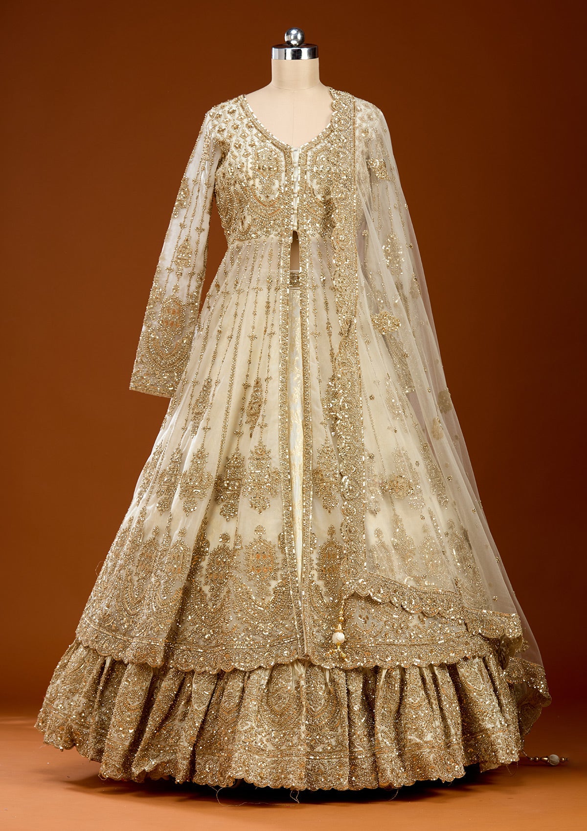 Gold Readymade Lehenga in Net fabric. The Lehenga is embellished with Cording embroidery. Accompanied with an Readymade blouse and dupatta. Comes with the Koskii promise of premium quality.