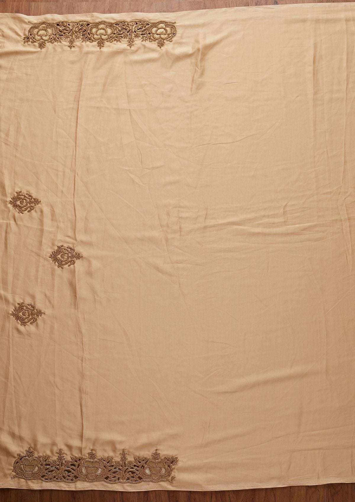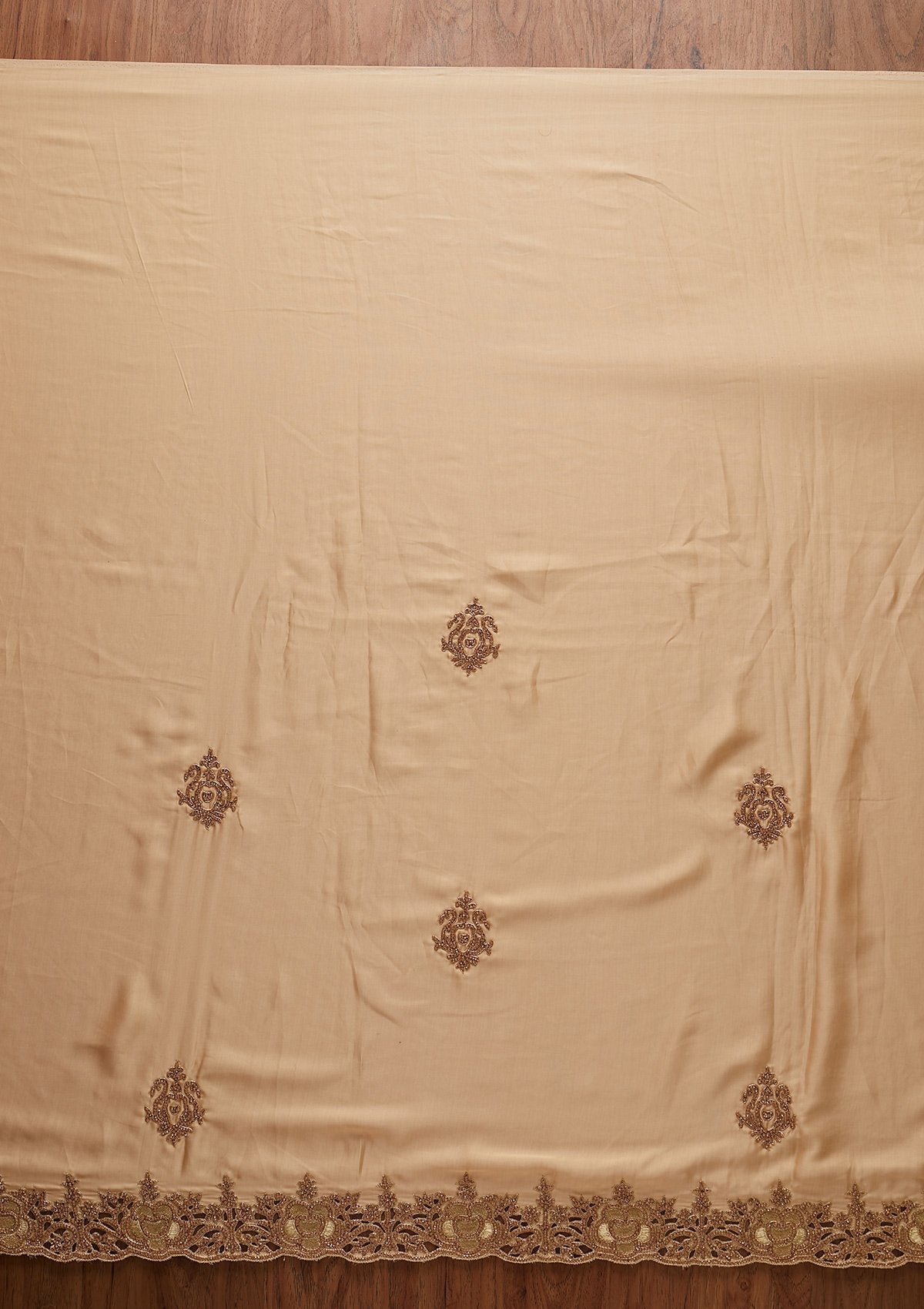 Gold Saree In Satin. The Saree Is Embellished With Cutdana Embroidery. Paired With A Matching Unstitched Blouse. Comes With The Koskii Promise Of Superior Quality.