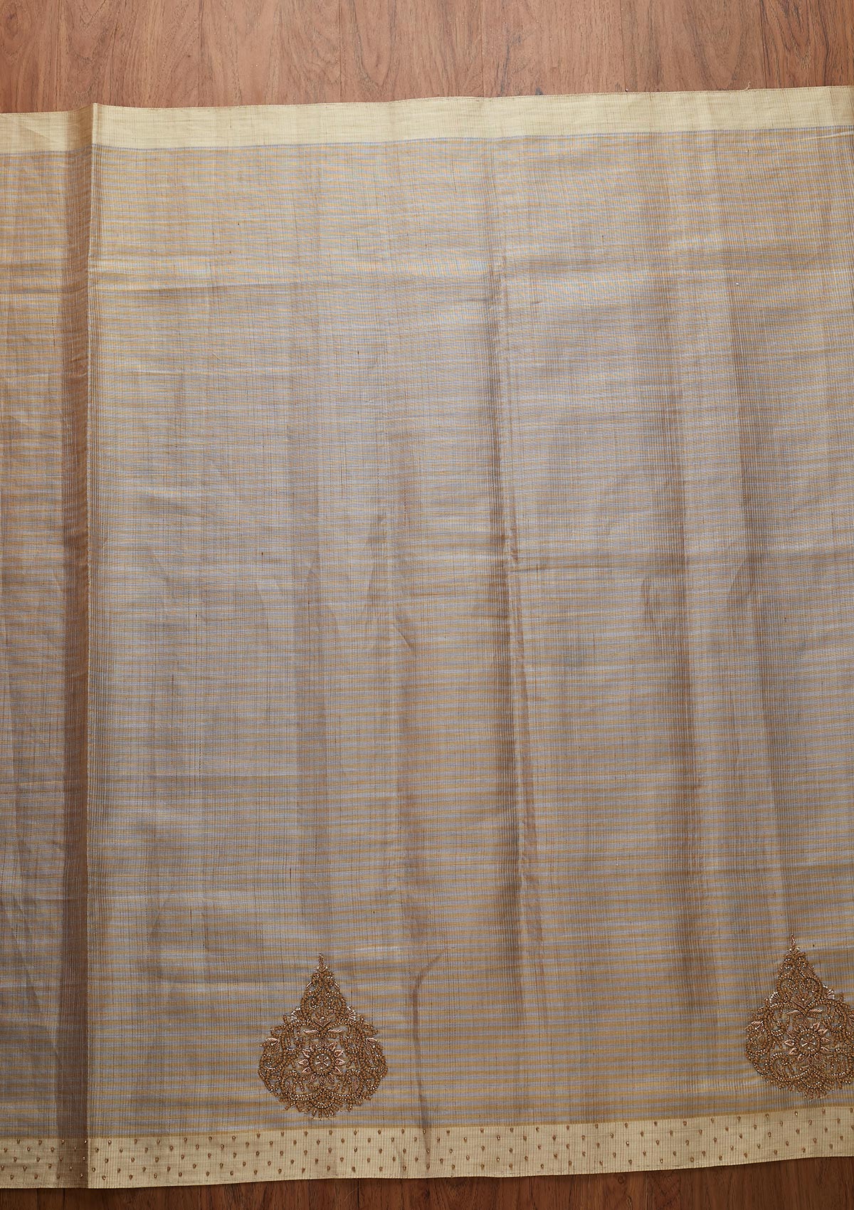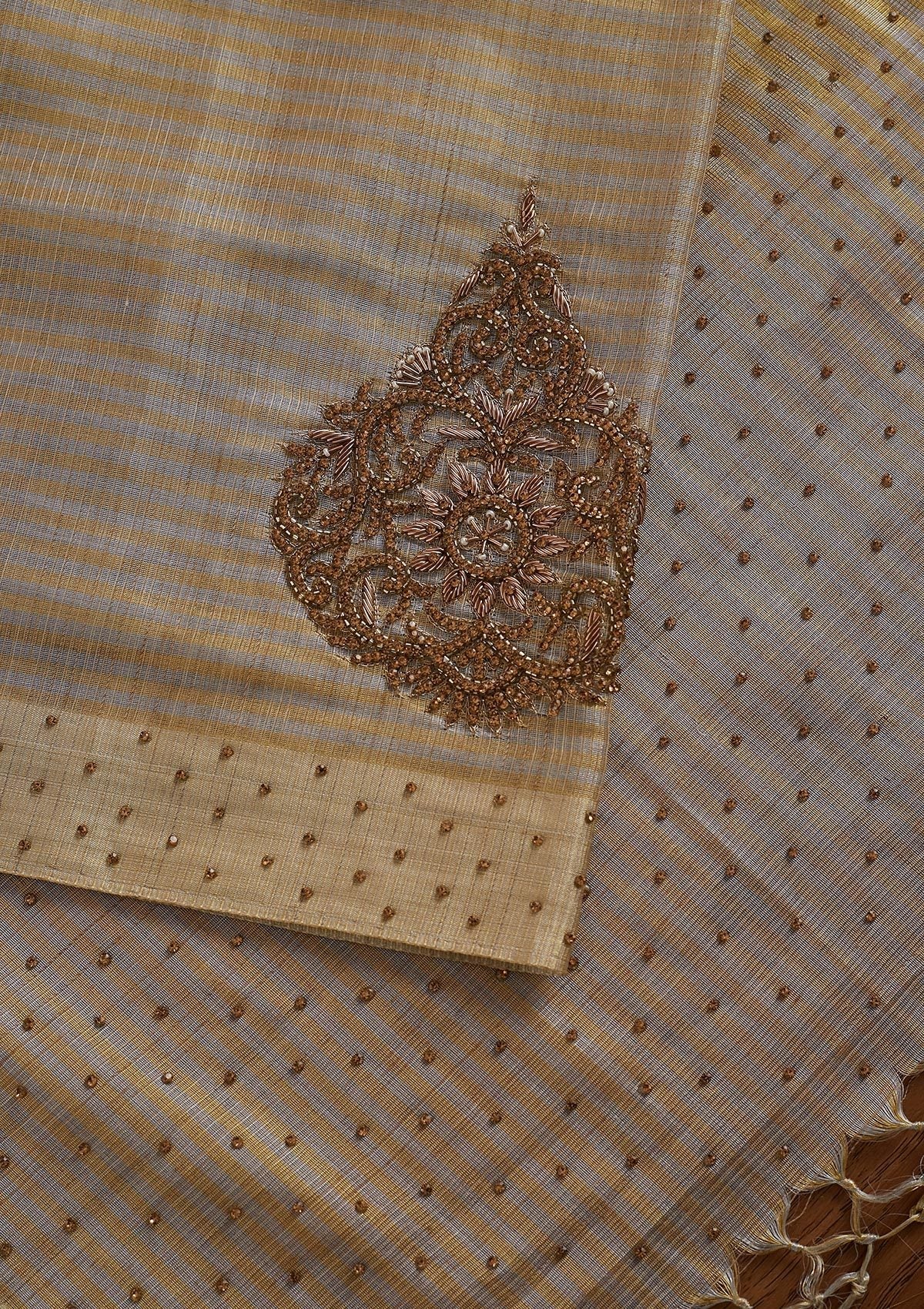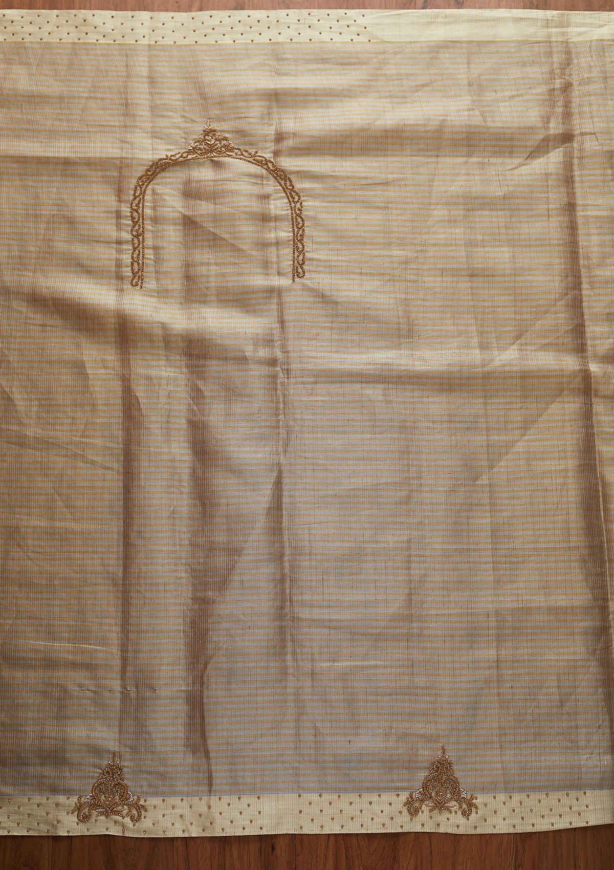 Gold Saree In Tissue. The Saree Is Embellished With Cutdana Embroidery. Paired With A Matching Unstitched Blouse. Comes With The Koskii Promise Of Superior Quality.
