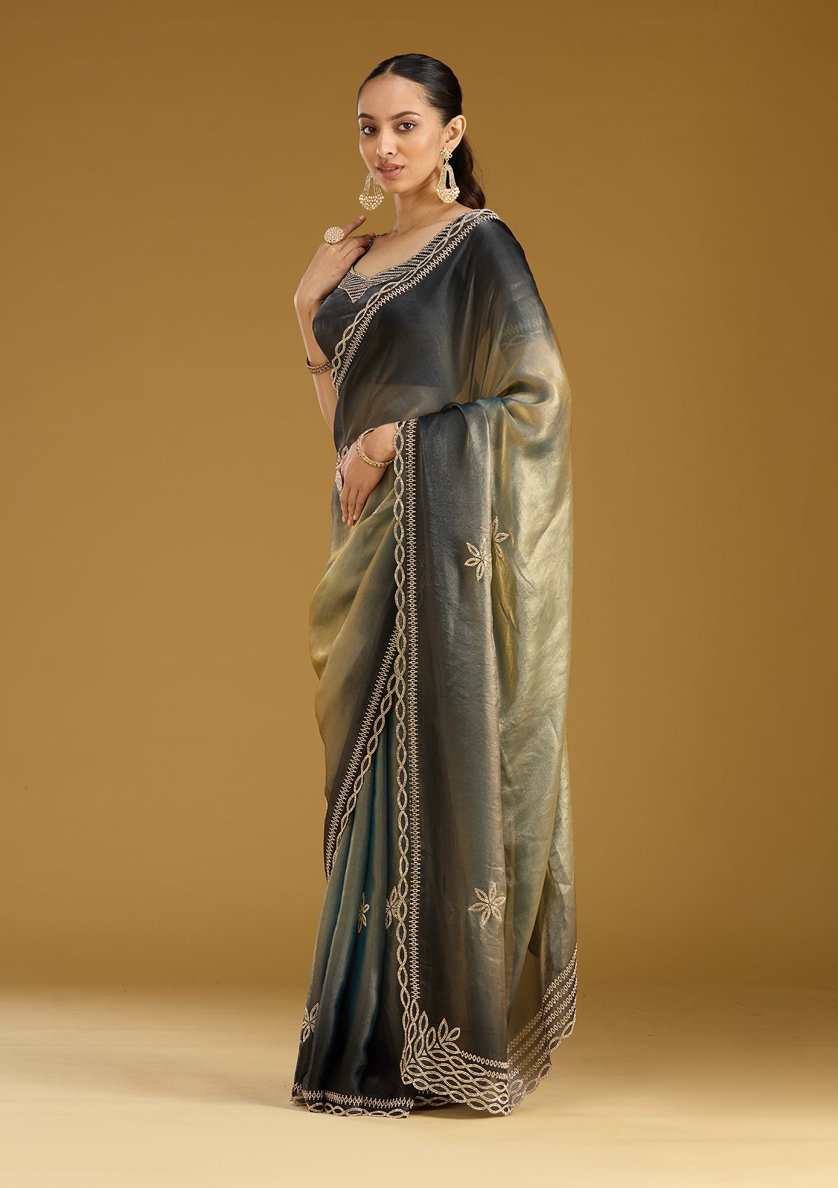 Gold Saree in Tissue fabric. The Saree is elevated with Stonework (Gold) embroidery. It comes with an Unstitched blouse. Comes with the Koskii promise of premium quality.