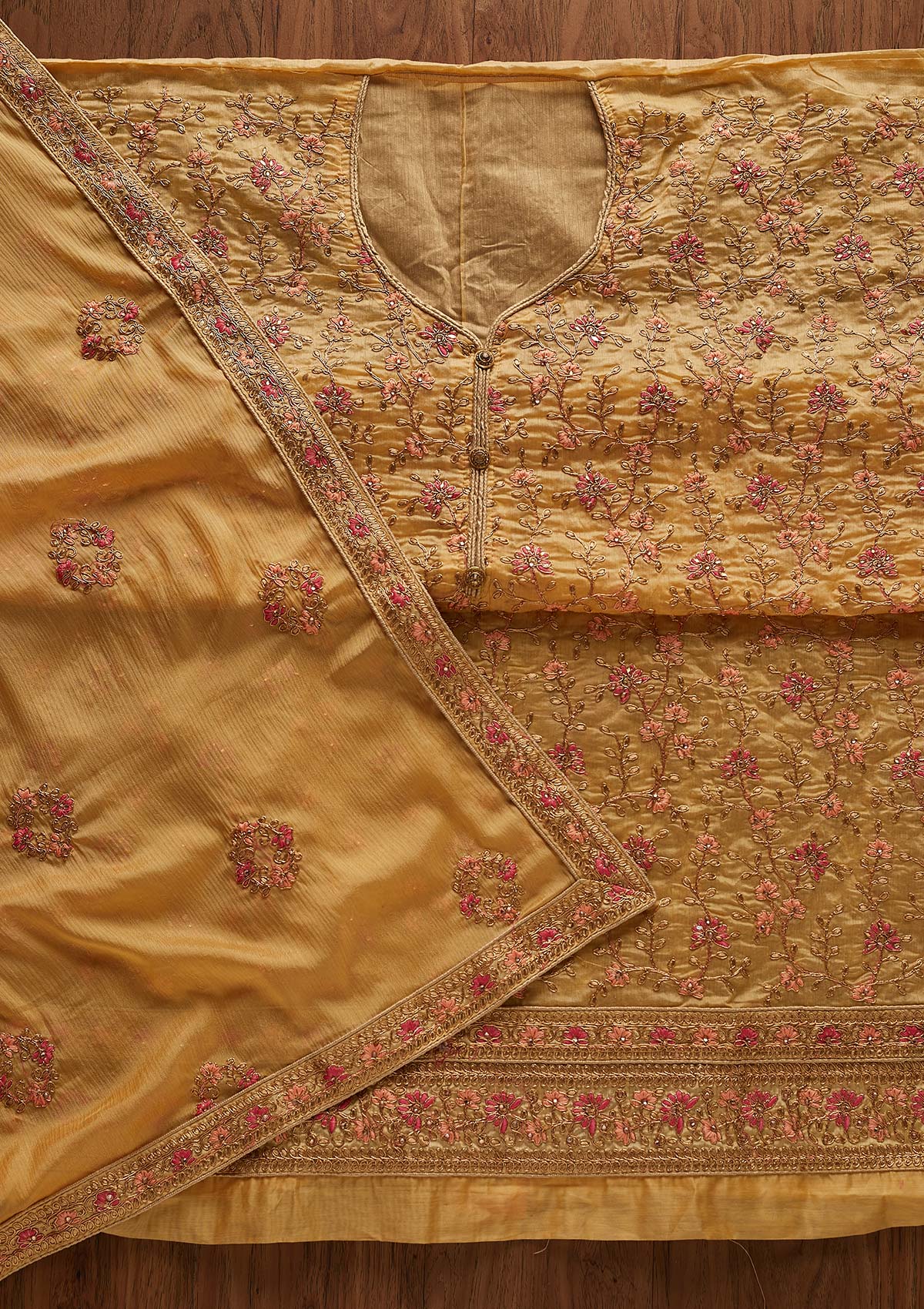 Gold Salwar Suit In Art Silk Fabric. The Salwar Suit Is Embellished With Zariwork Embroidery. Accompanied with an unstitched bottom and dupatta. Comes With The Koskii Promise Of Premium Quality.