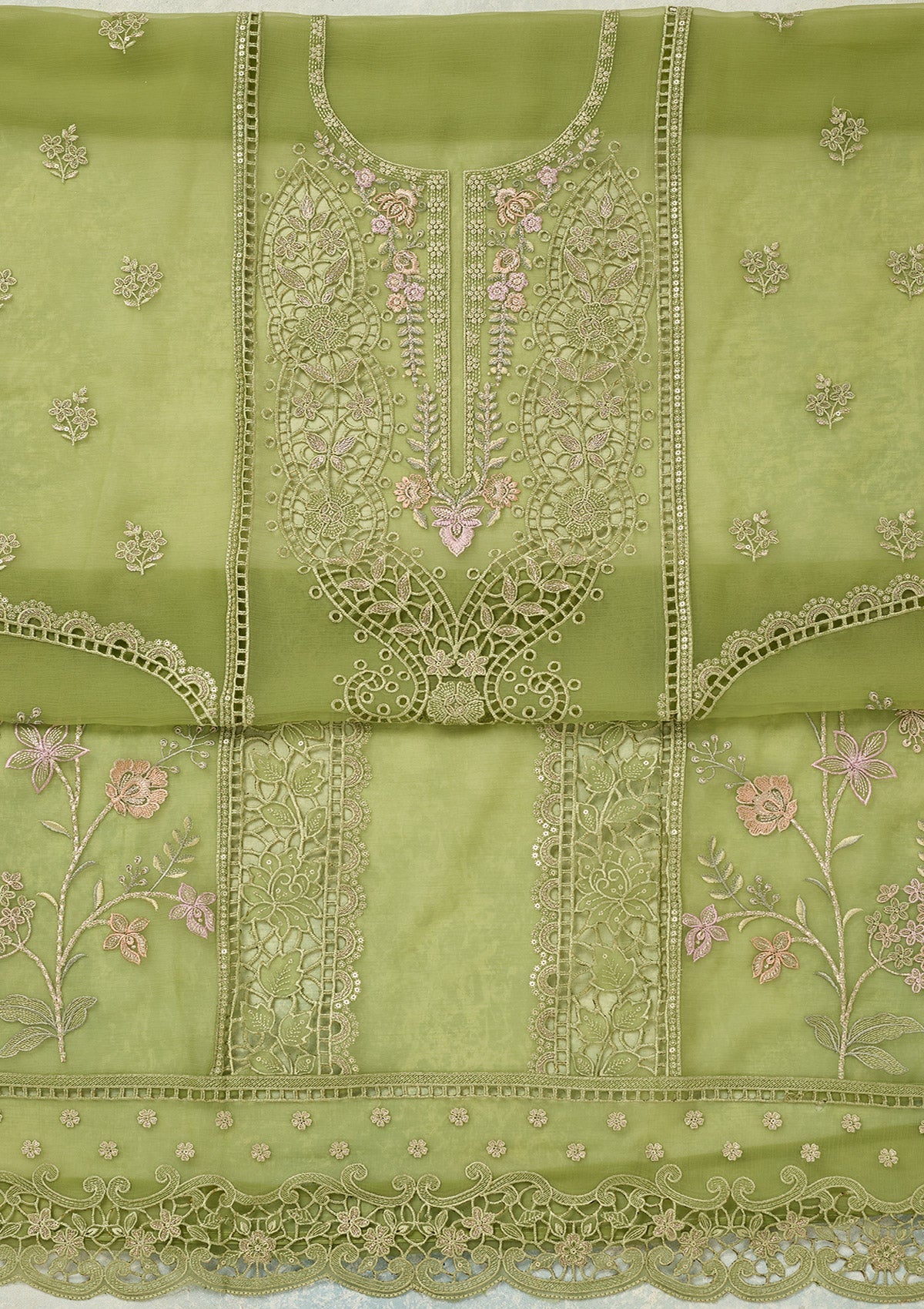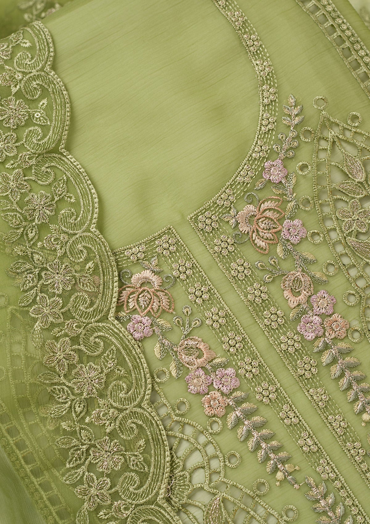 Green Salwar_UM in Tissue fabric. The Salwar_UM is embellished with Threadwork embroidery. Accompanied with a bottom and dupatta. Comes with the Koskii promise of premium quality.