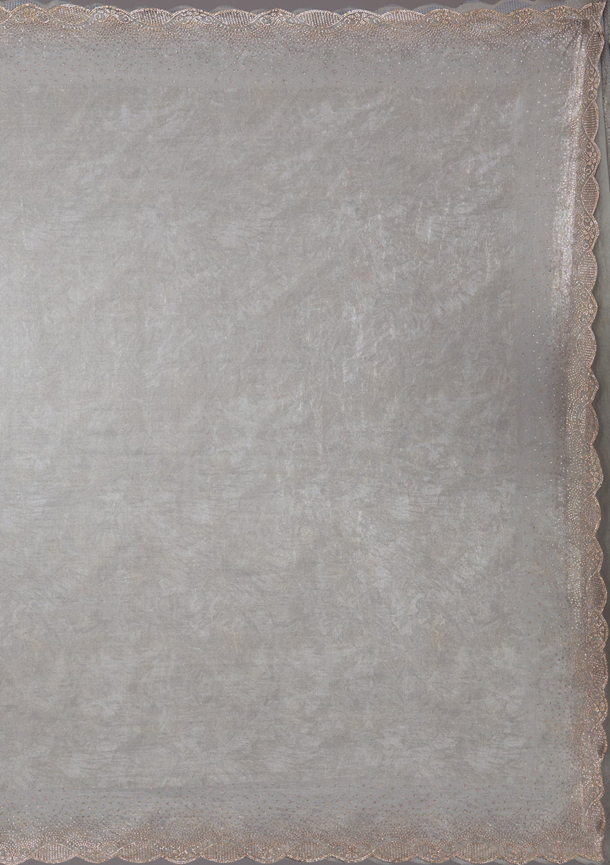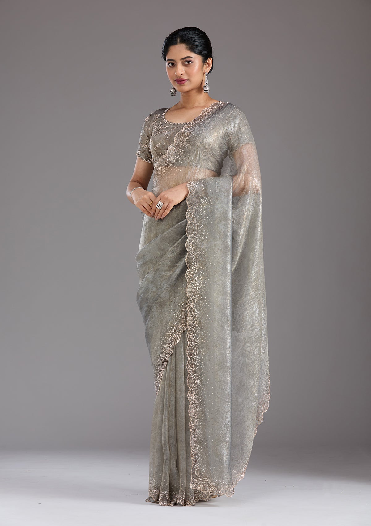Grey Saree in Tissue fabric. The Saree is elevated with Stonework (Gold) embroidery. It comes with an Unstitched blouse. Comes with the Koskii promise of premium quality.