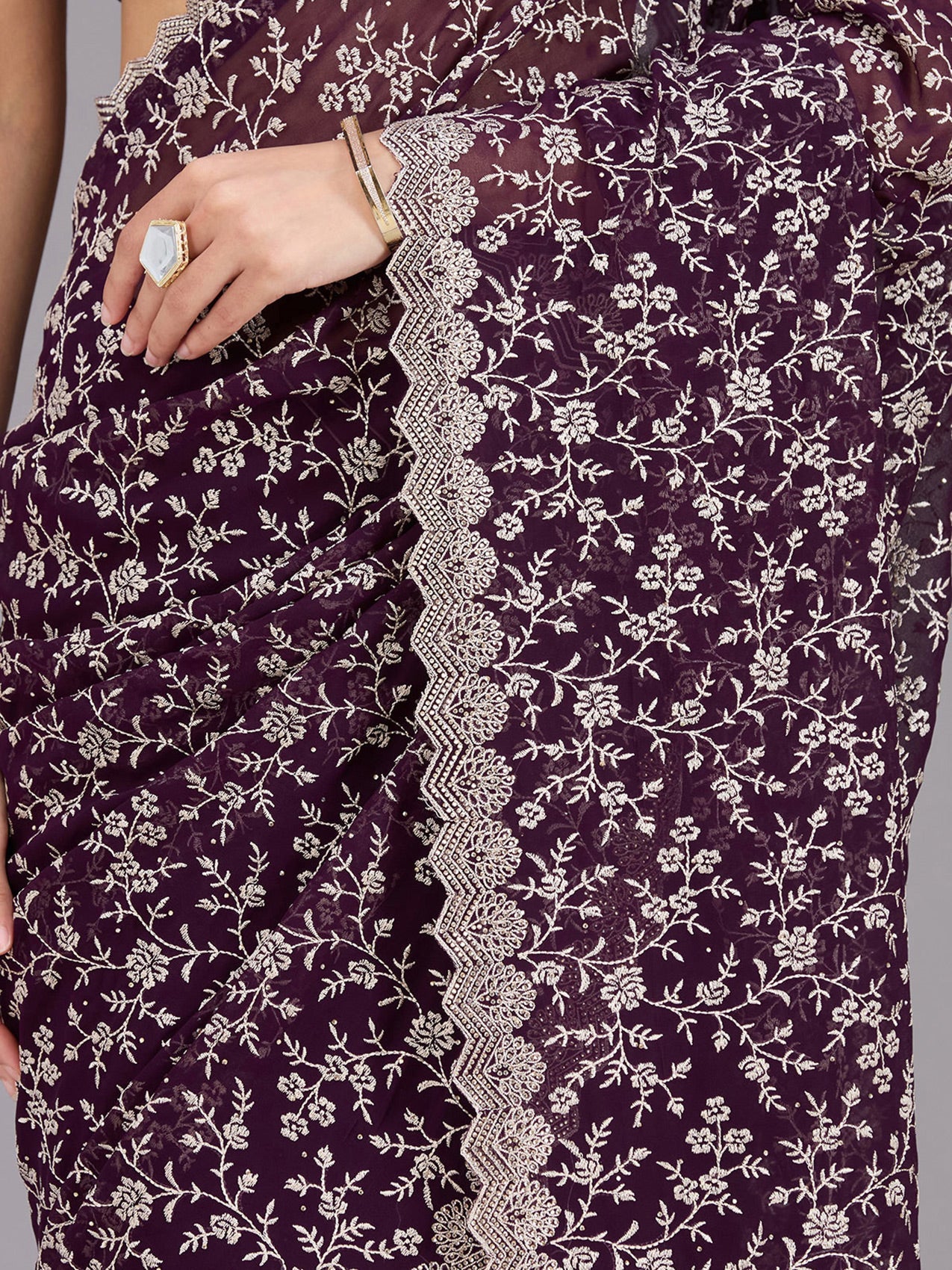 Purple Saree in Georgette fabric. The Saree is elevated with Zariwork (Silver) embroidery. It comes with an Unstitched blouse. Comes with the Koskii promise of premium quality.
