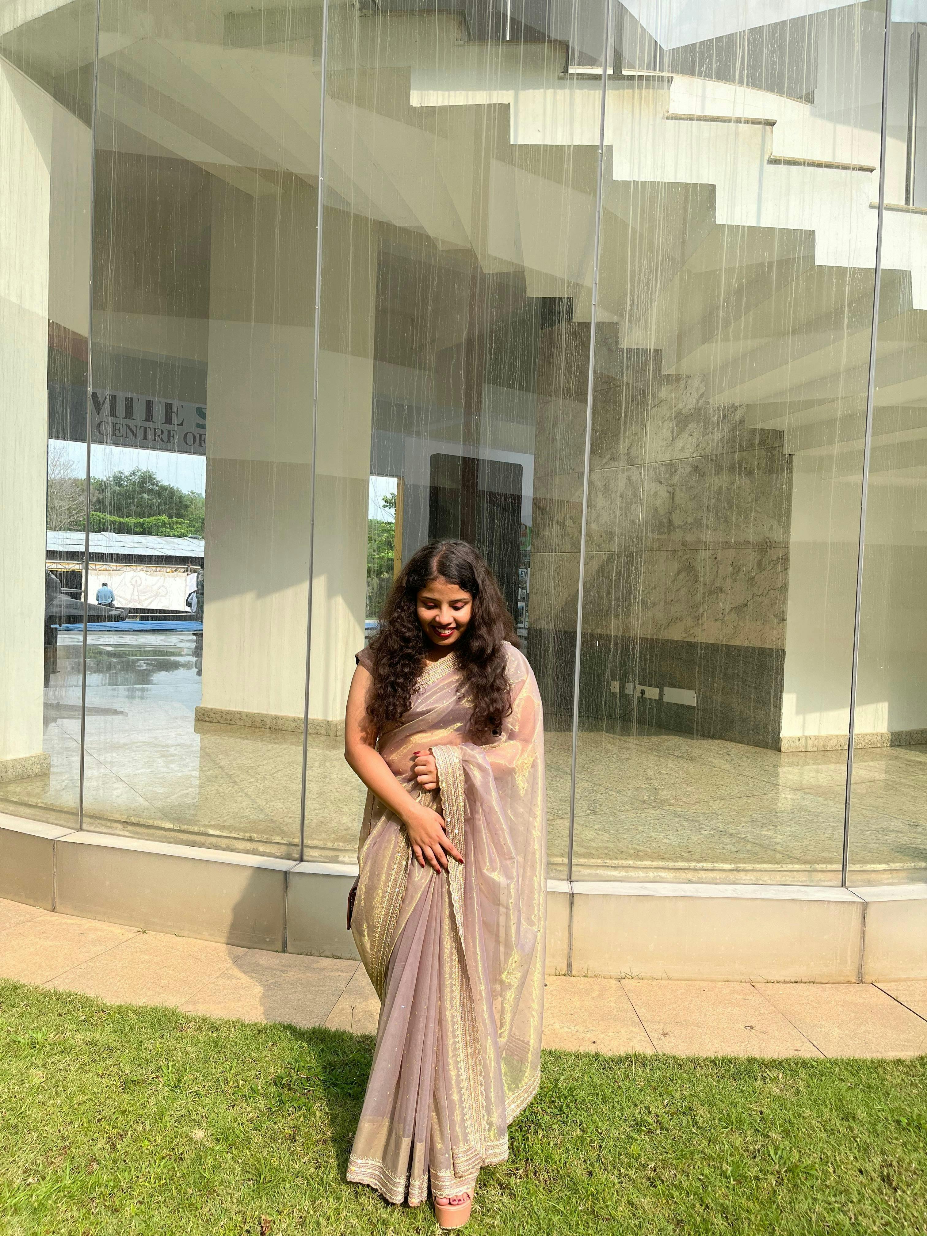Grey Saree in Tissue fabric. The Saree is elevated with Zariwork embroidery. It comes with an Unstitched blouse. Comes with the Koskii promise of premium quality.