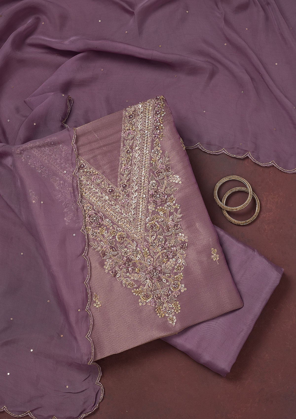 Lavender Salwar Suit in Organza fabric. The Salwar Suit is embellished with Cutdana embroidery. Accompanied with a bottom and dupatta. Comes with the Koskii promise of premium quality.