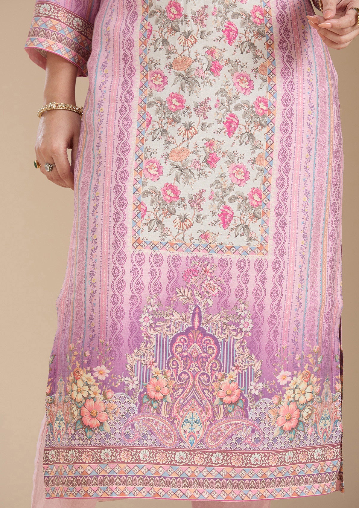 Lavender Salwar Suit in Crepe fabric. The Salwar Suit is embellished with Printed embroidery. Accompanied with a bottom and dupatta. Comes with the Koskii promise of premium quality.