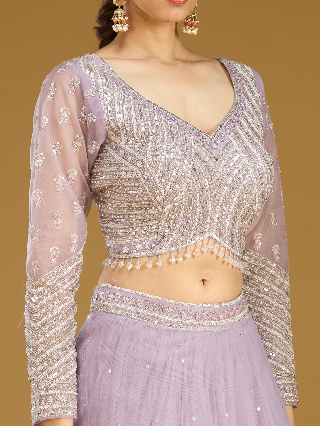 Lavender Readymade Lehenga in Net fabric. The Lehenga is embellished with Sequins embroidery. Accompanied with an Readymade blouse and dupatta. Comes with the Koskii promise of premium quality.