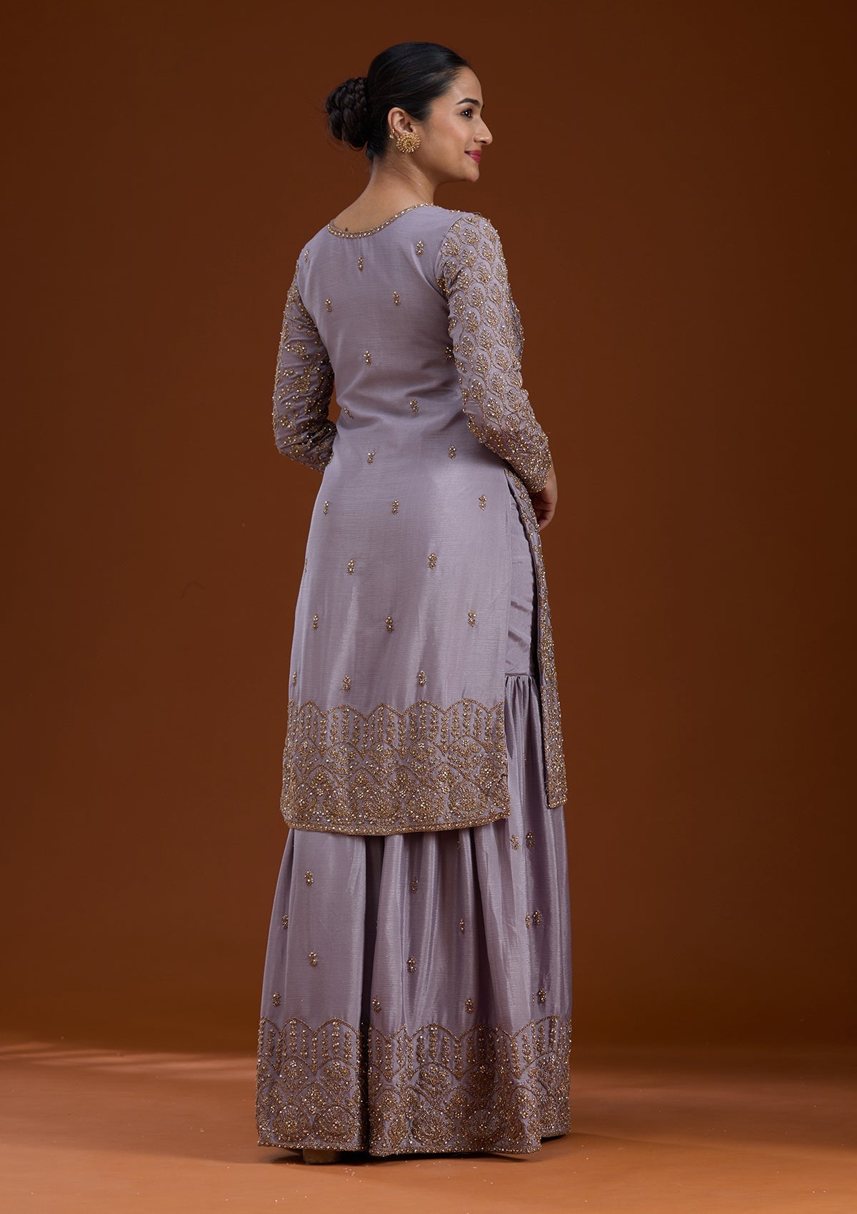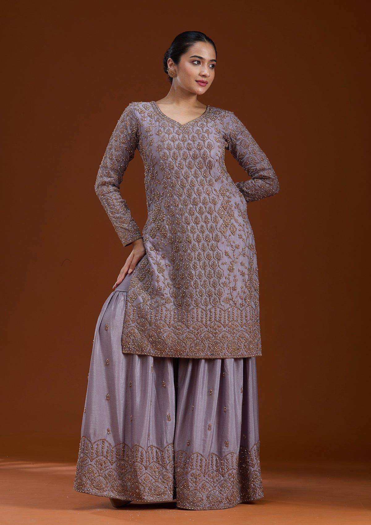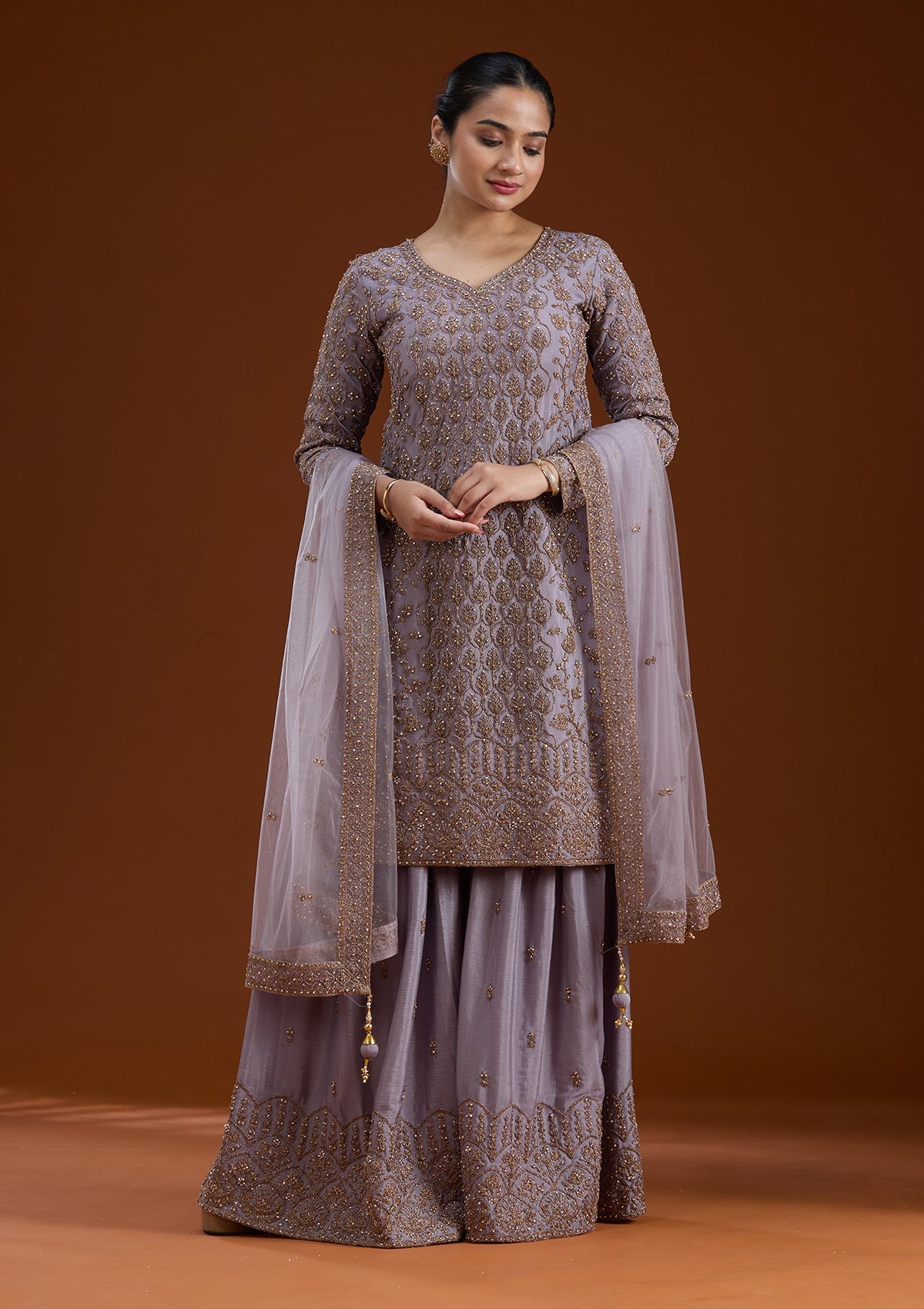 Lavender Salwar Suit in Georgette fabric The Salwar Suit is embellished with Stonework (Gold) embroidery Accompanied with a bottom and dupatta Comes with the Koskii promise of premium quality.