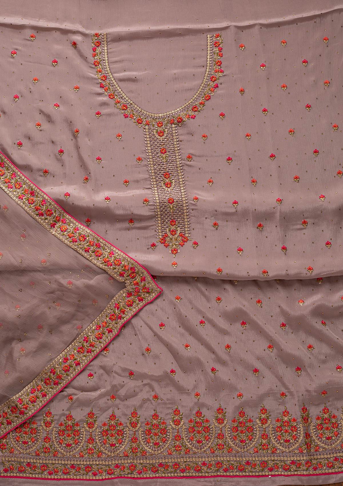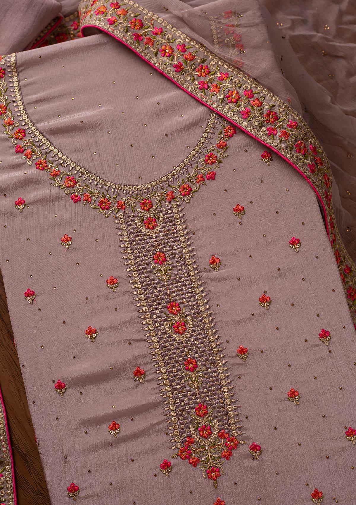 Lavender Salwar Suit In Semi Crepe Fabric. The Salwar Suit Is Embellished With Threadwork Embroidery. Accompanied with an unstitched bottom and dupatta. Comes With The Koskii Promise Of Premium Quality.