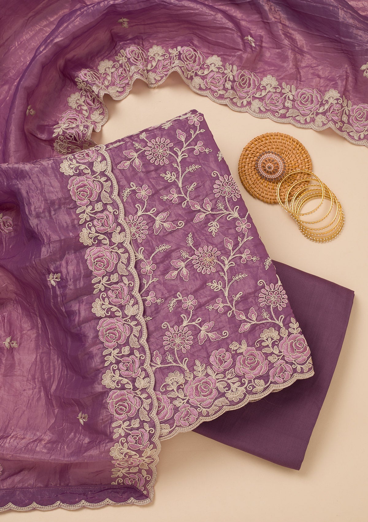Lavender Salwar Suit in Semi Crepe fabric. The Salwar Suit is embellished with Threadwork embroidery. Accompanied with a bottom and dupatta. Comes with the Koskii promise of premium quality.