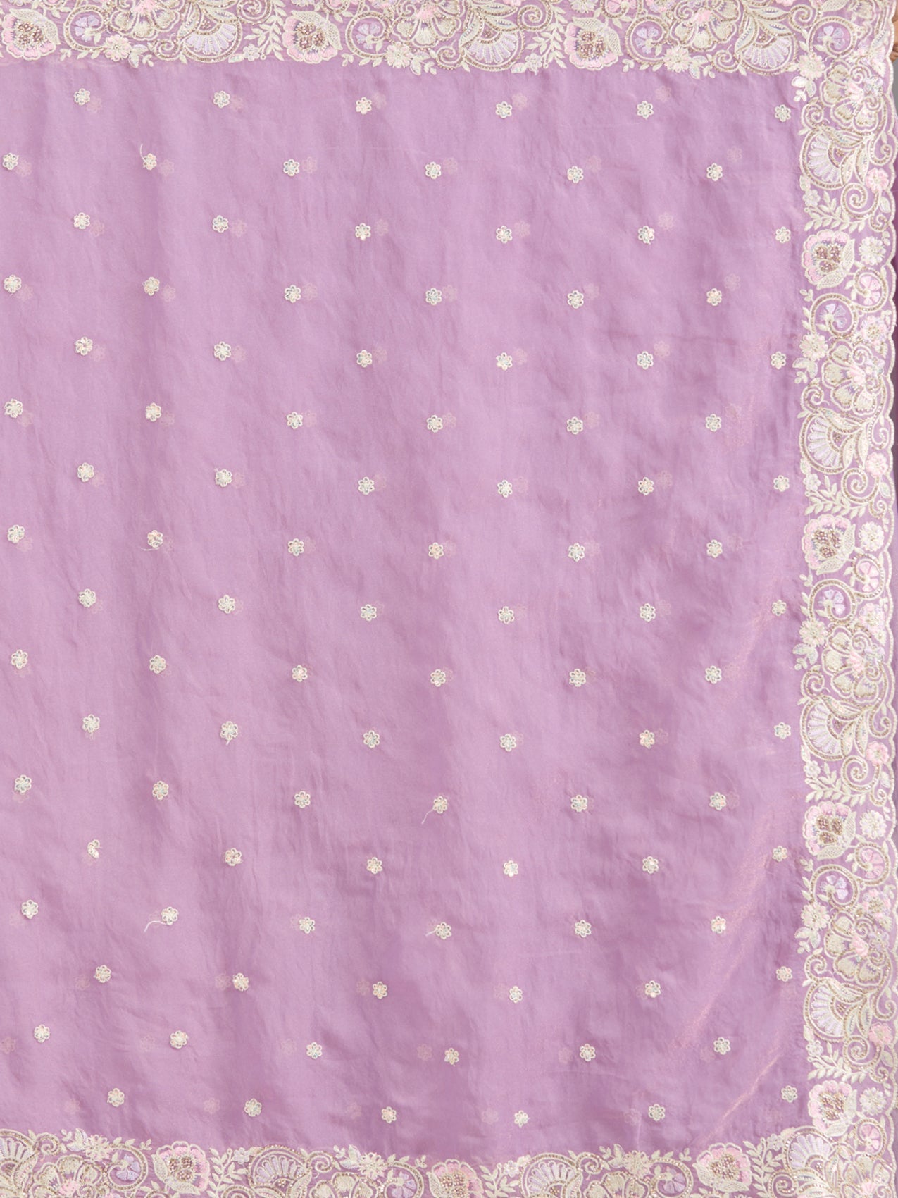 Lavender Saree in Tissue fabric The Saree is elevated with Threadwork embroidery It comes with an Unstitched blouse Comes with the Koskii promise of premium quality.
