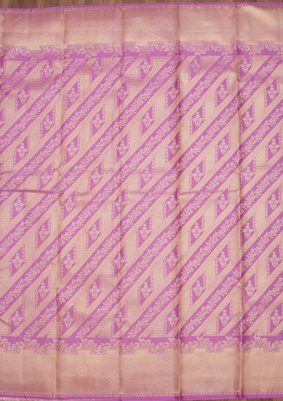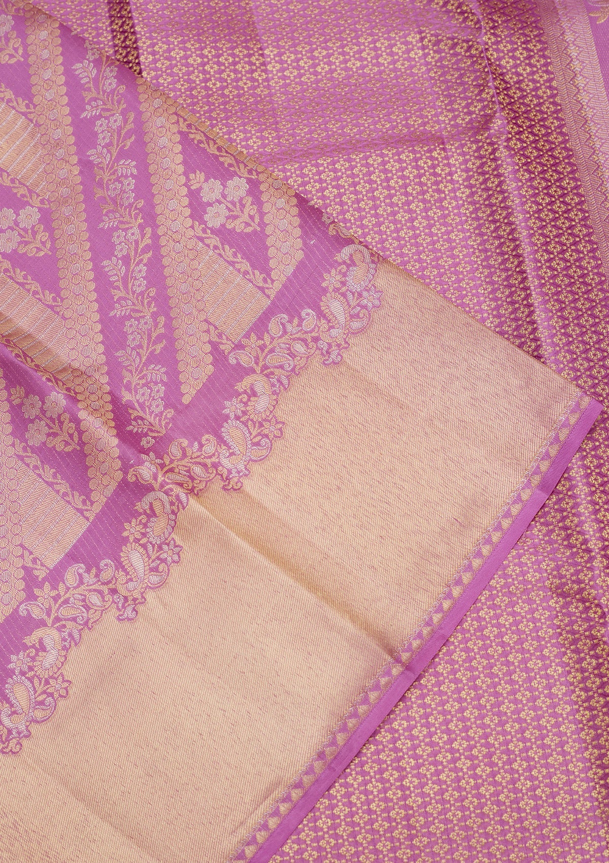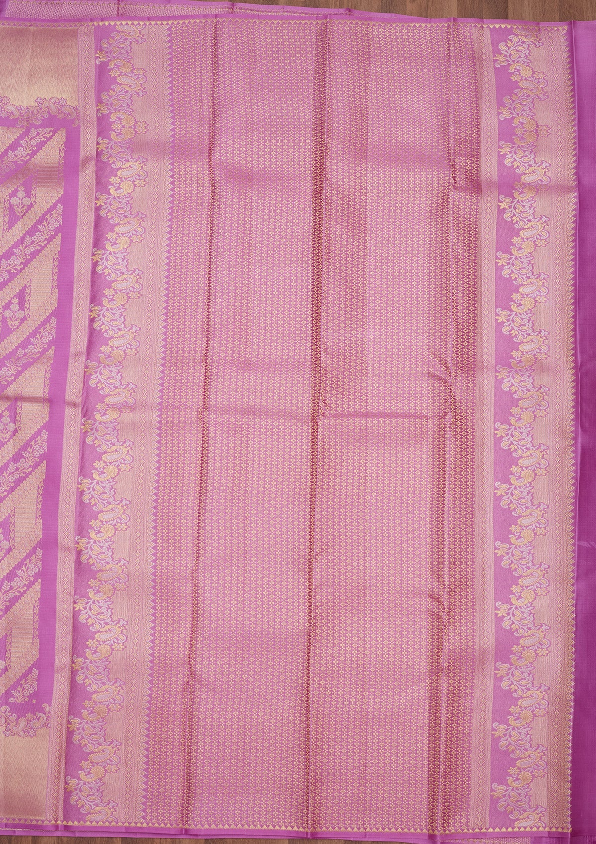 Lavender Silk_Saree in Pure Silk fabric. The Silk_Saree is elevated with Zariwork (Gold) embroidery. It comes with an Unstitched blouse. Comes with the Koskii promise of premium quality.