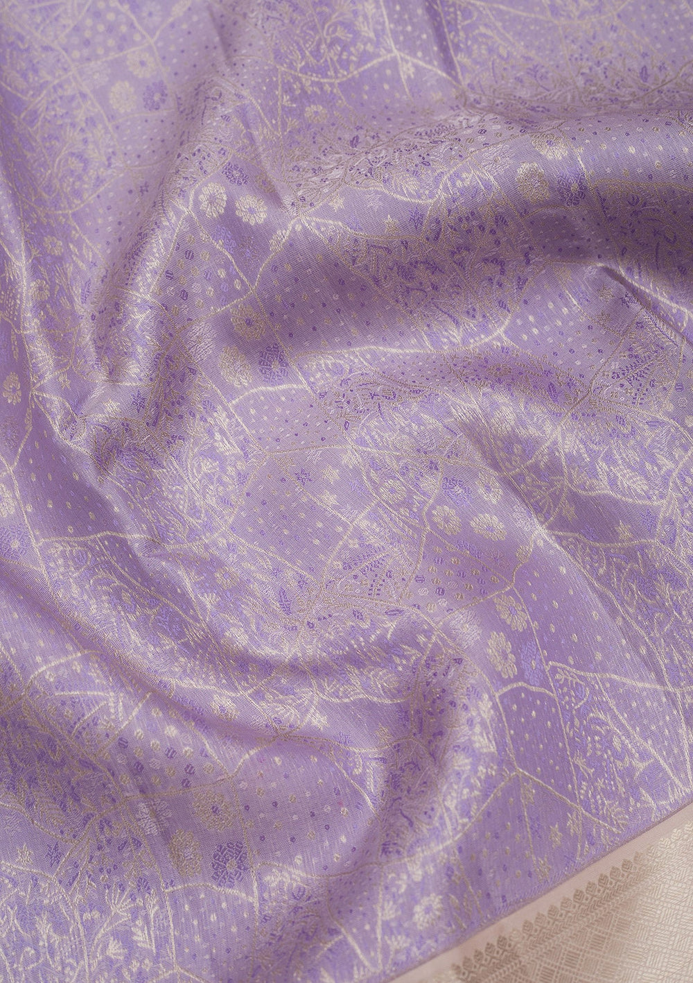 Lavender Saree in Pure Silk fabric. The Saree is elevated with Zariwork embroidery. It comes with an Unstitched blouse. Comes with the Koskii promise of premium quality.
