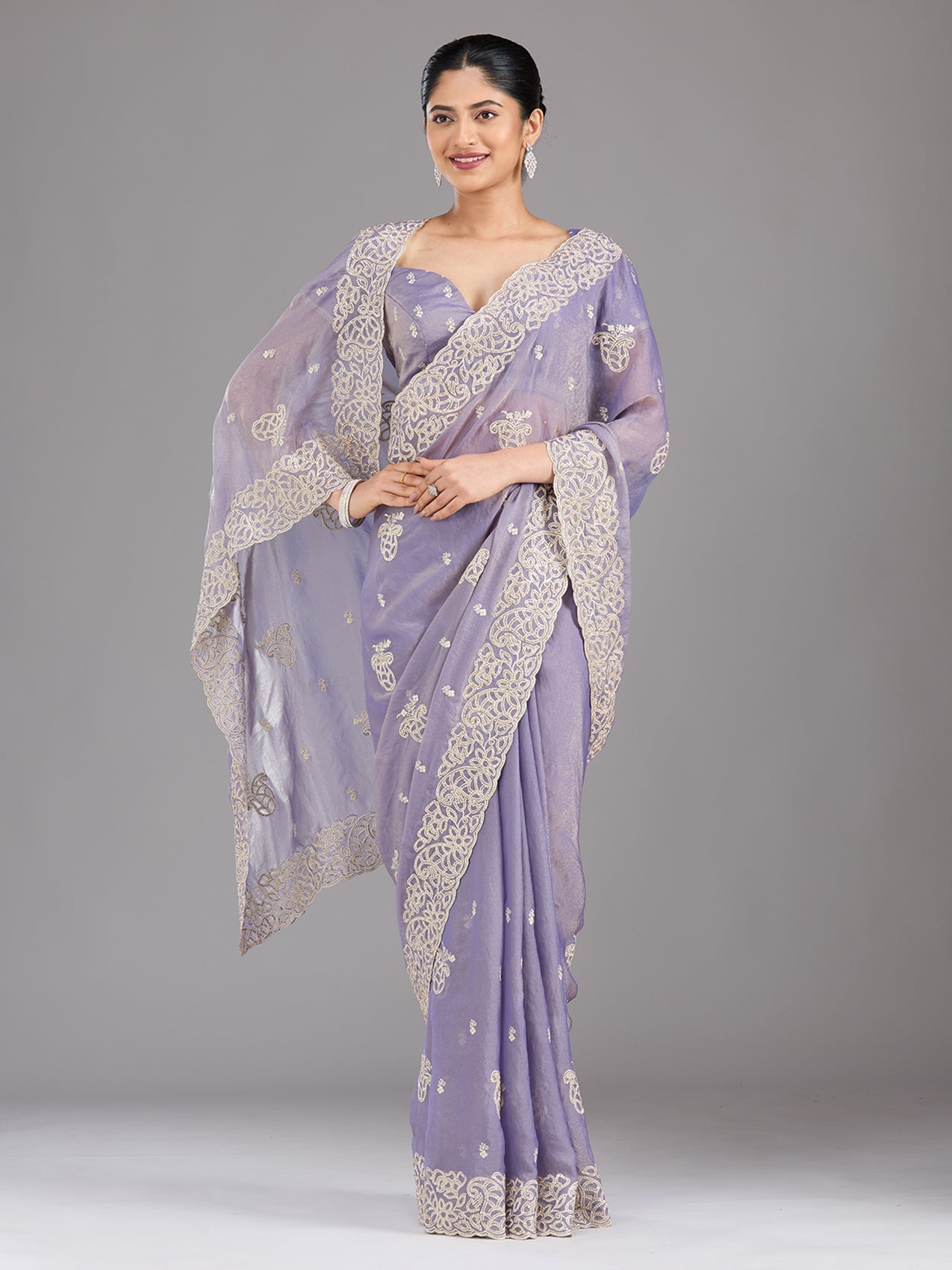 Lavender Saree in Tissue fabric The Saree is elevated with Zariwork (Silver) embroidery It comes with an Unstitched blouse Comes with the Koskii promise of premium quality.