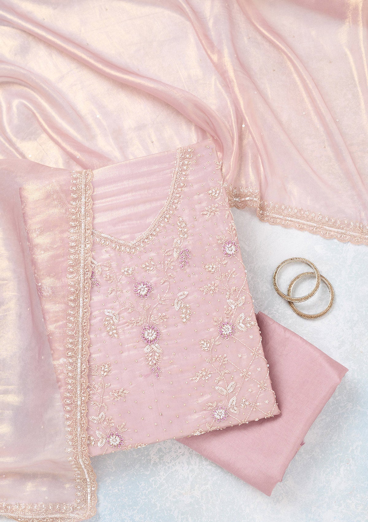 Lavender Salwar Suit in Tissue fabric. The Salwar Suit is embellished with Zariwork embroidery. Accompanied with a bottom and dupatta. Comes with the Koskii promise of premium quality.