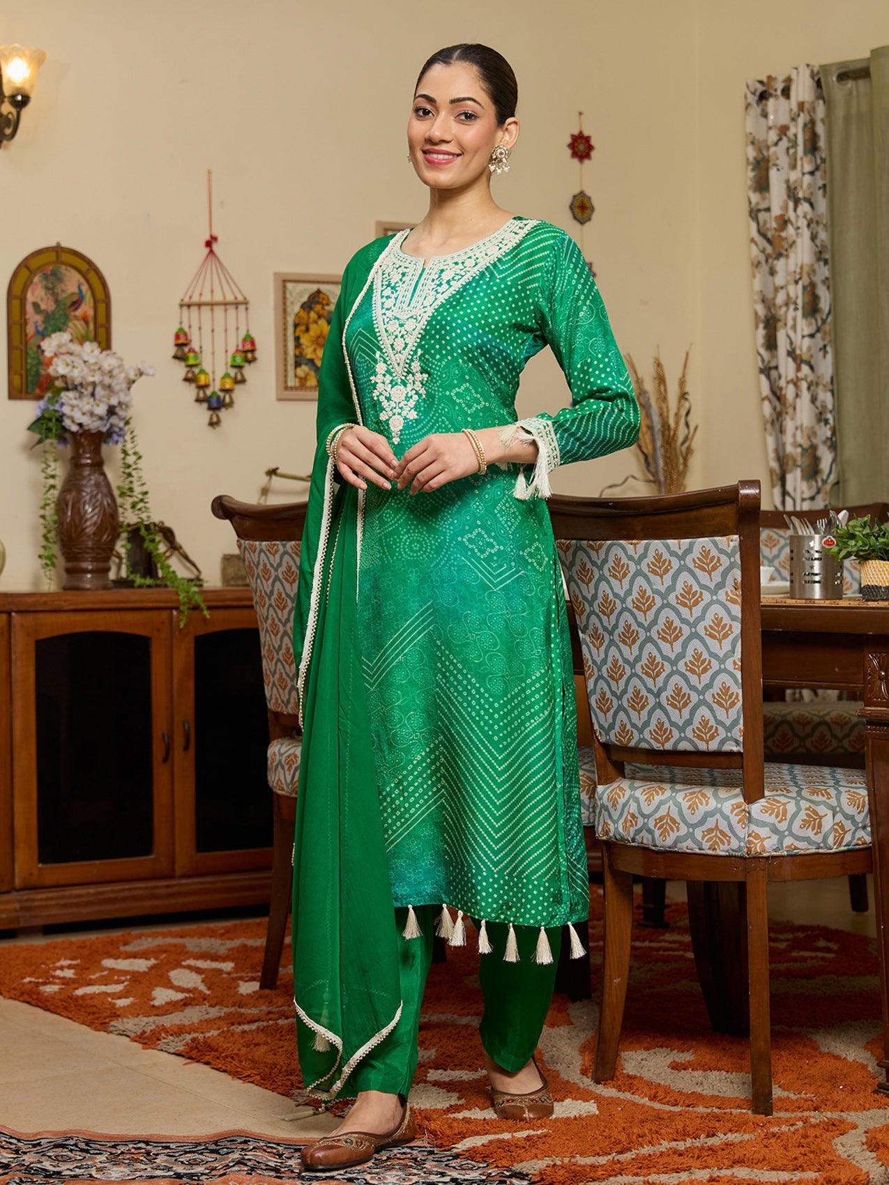 Leaf Green Salwar Suit in Crepe fabric. The Salwar Suit is embellished with Threadwork embroidery. Accompanied with a bottom and dupatta. Comes with the Koskii promise of premium quality.