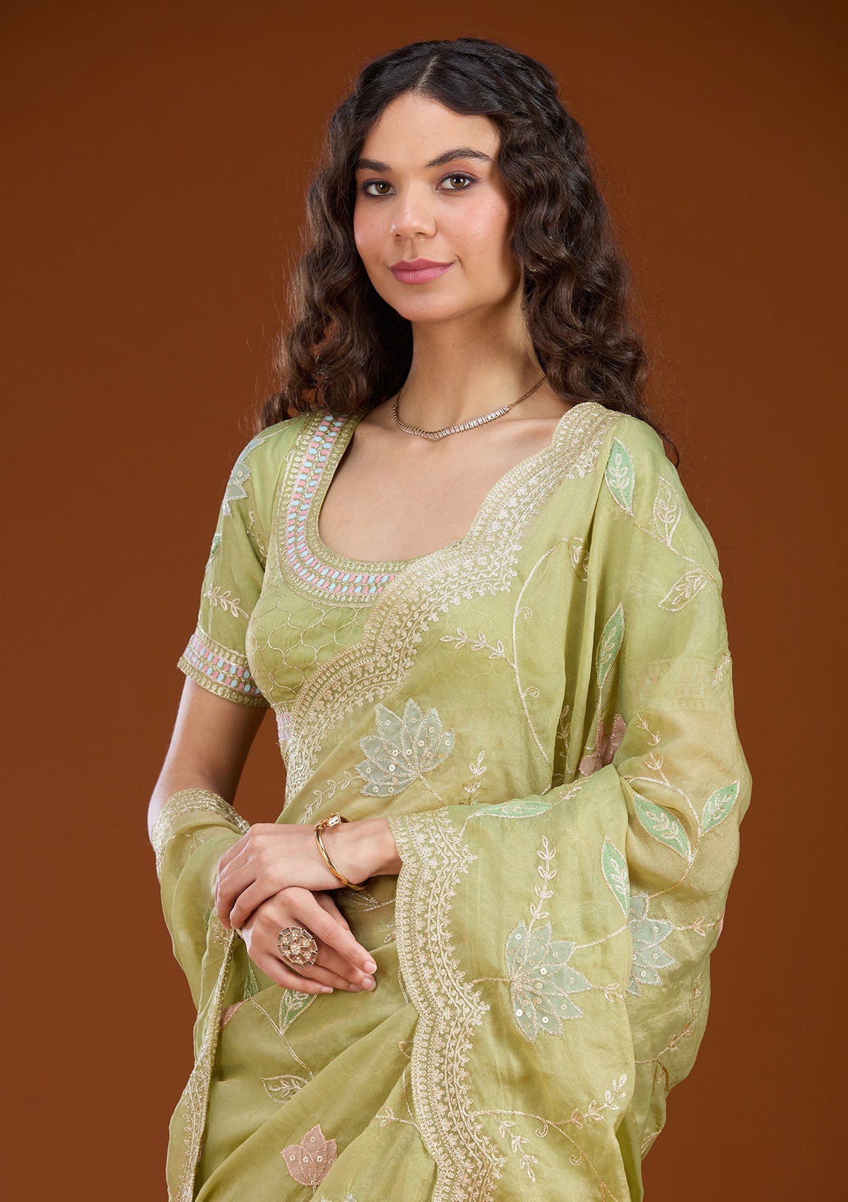 Leaf Green Saree in Tissue fabric. The Saree is elevated with Zardozi (Gold) embroidery. It comes with an Unstitched blouse. Comes with the Koskii promise of premium quality.