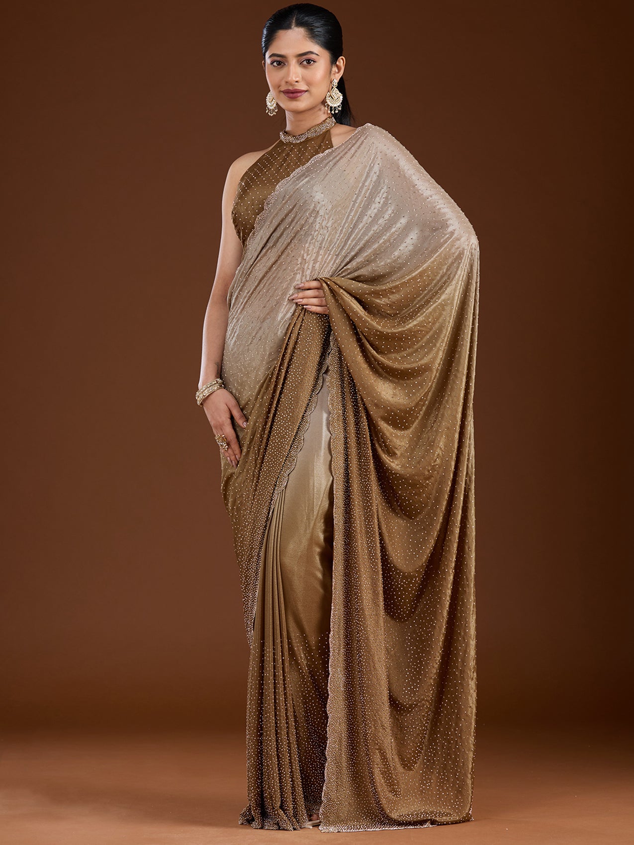 Light Grey Stonework (Gold) Satin Saree