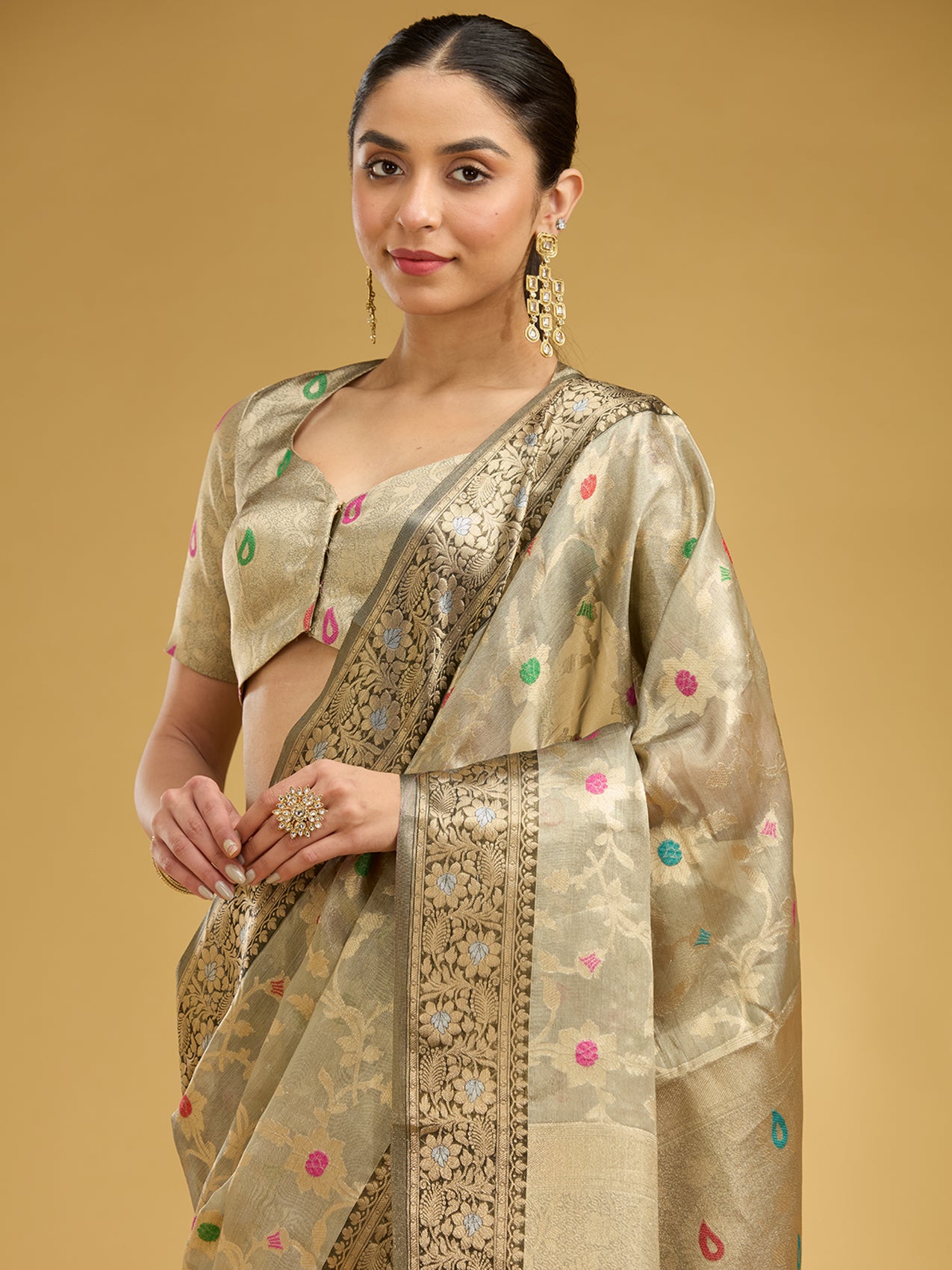 Light Grey Silk_Saree in Tissue fabric. The Silk_Saree is elevated with Zariwork embroidery. It comes with an Unstitched blouse. Comes with the Koskii promise of premium quality.