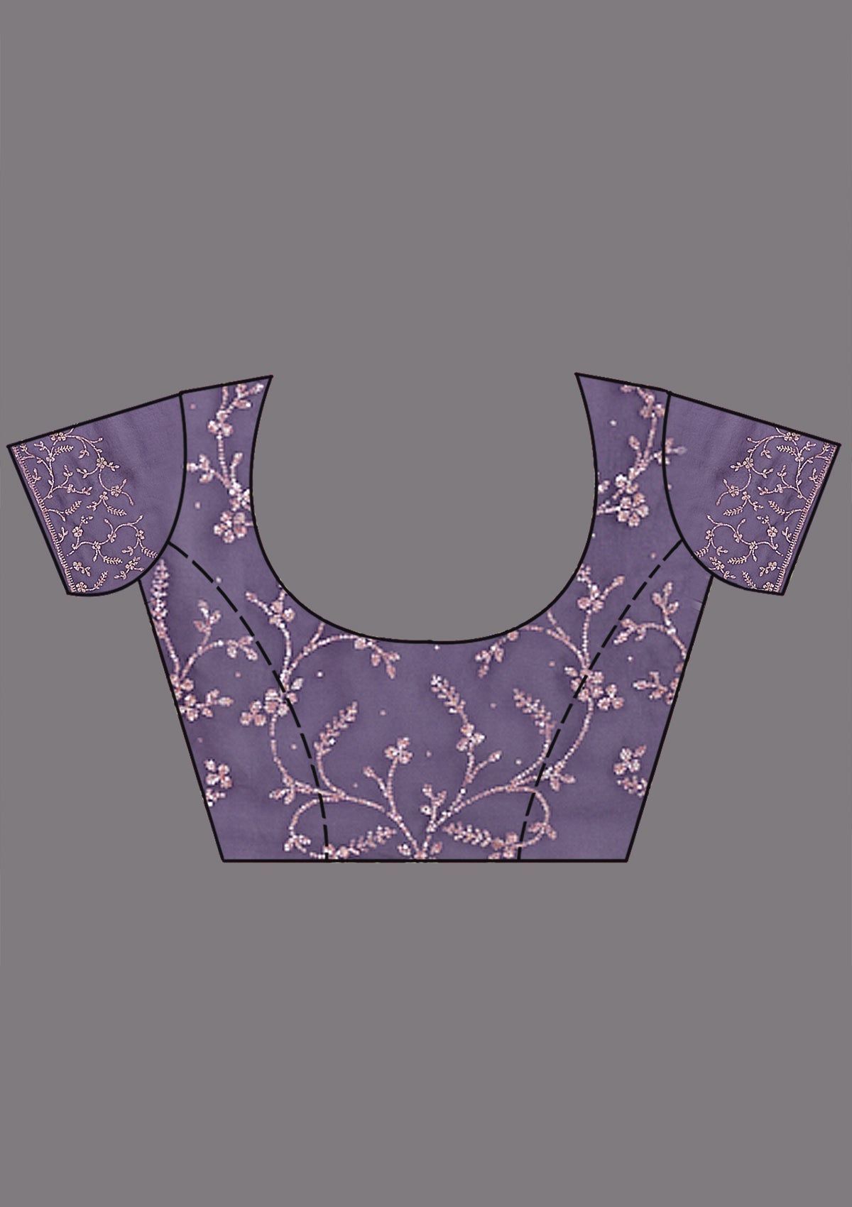 Light Lavender Saree in Tissue fabric. The Saree is elevated with Stonework (Gold) embroidery. It comes with an Unstitched blouse. Comes with the Koskii promise of premium quality.