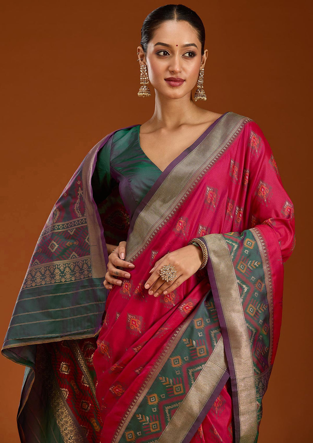 Magenta Pink Saree in Art Silk fabric. The Silk Saree is elevated with Kanjivaram embroidery. It comes with an Unstitched blouse. Comes with the Koskii promise of premium quality.