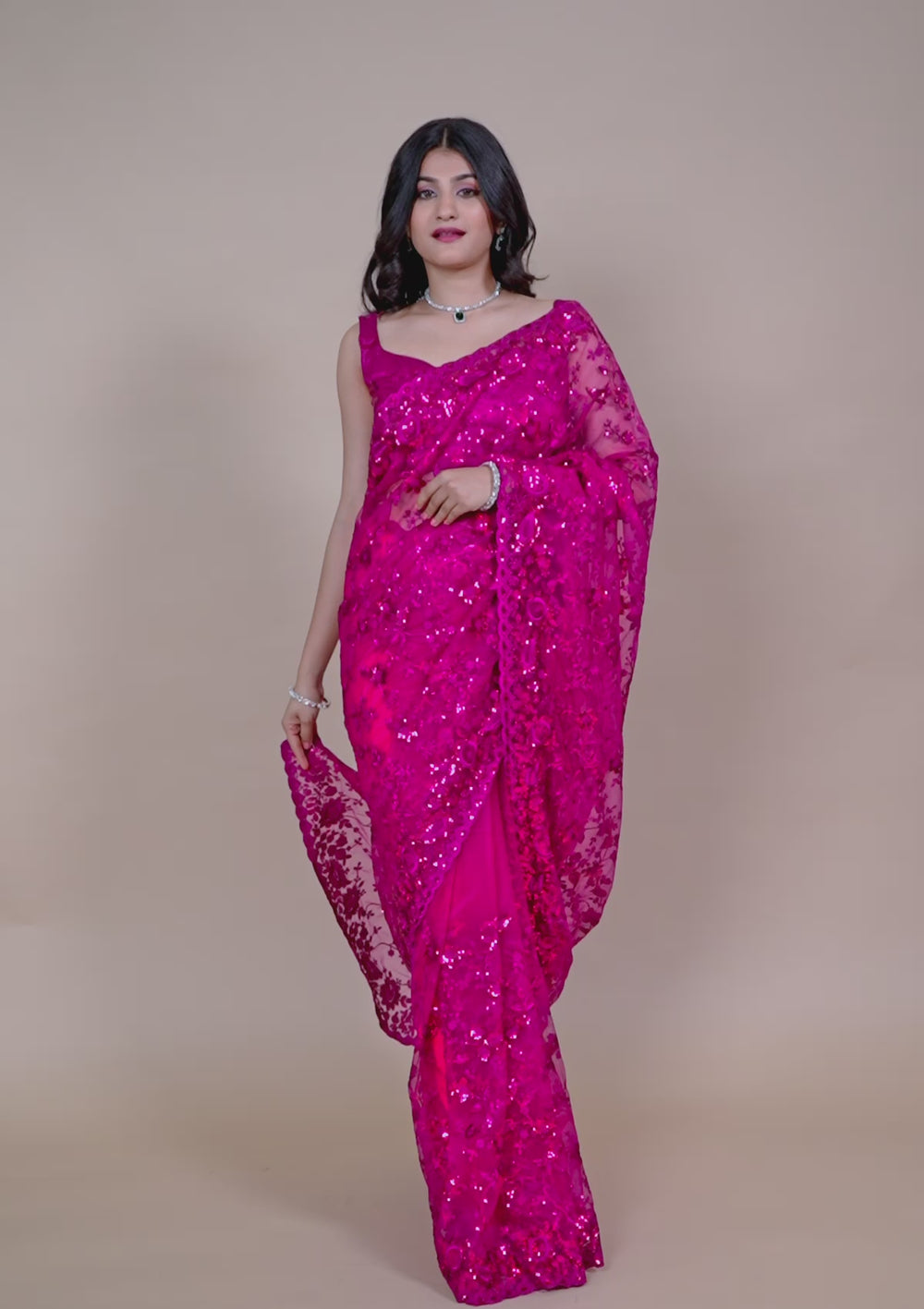 Magenta Pink Sequins Net Saree