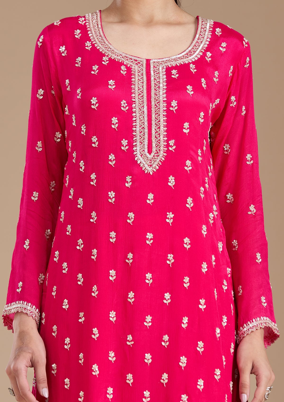 Magenta Pink Salwar Suit in Soft Raw Silk fabric. The Salwar Suit is embellished with Sequins embroidery. Accompanied with a bottom and dupatta. Comes with the Koskii promise of premium quality.