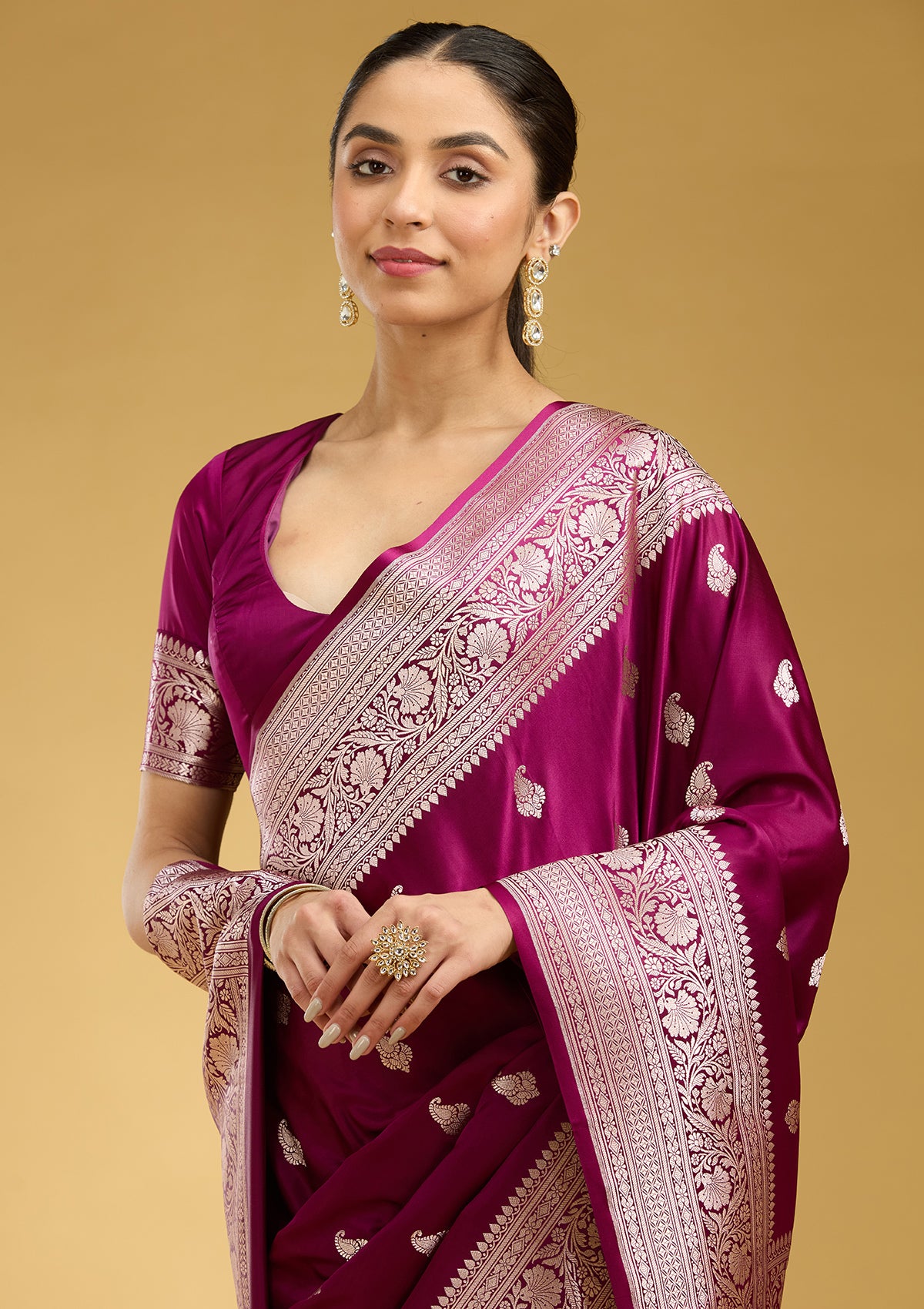 Magenta Pink Silk_Saree in Satin fabric. The Silk_Saree is elevated with Zariwork (Gold) embroidery. It comes with an Unstitched blouse. Comes with the Koskii promise of premium quality.