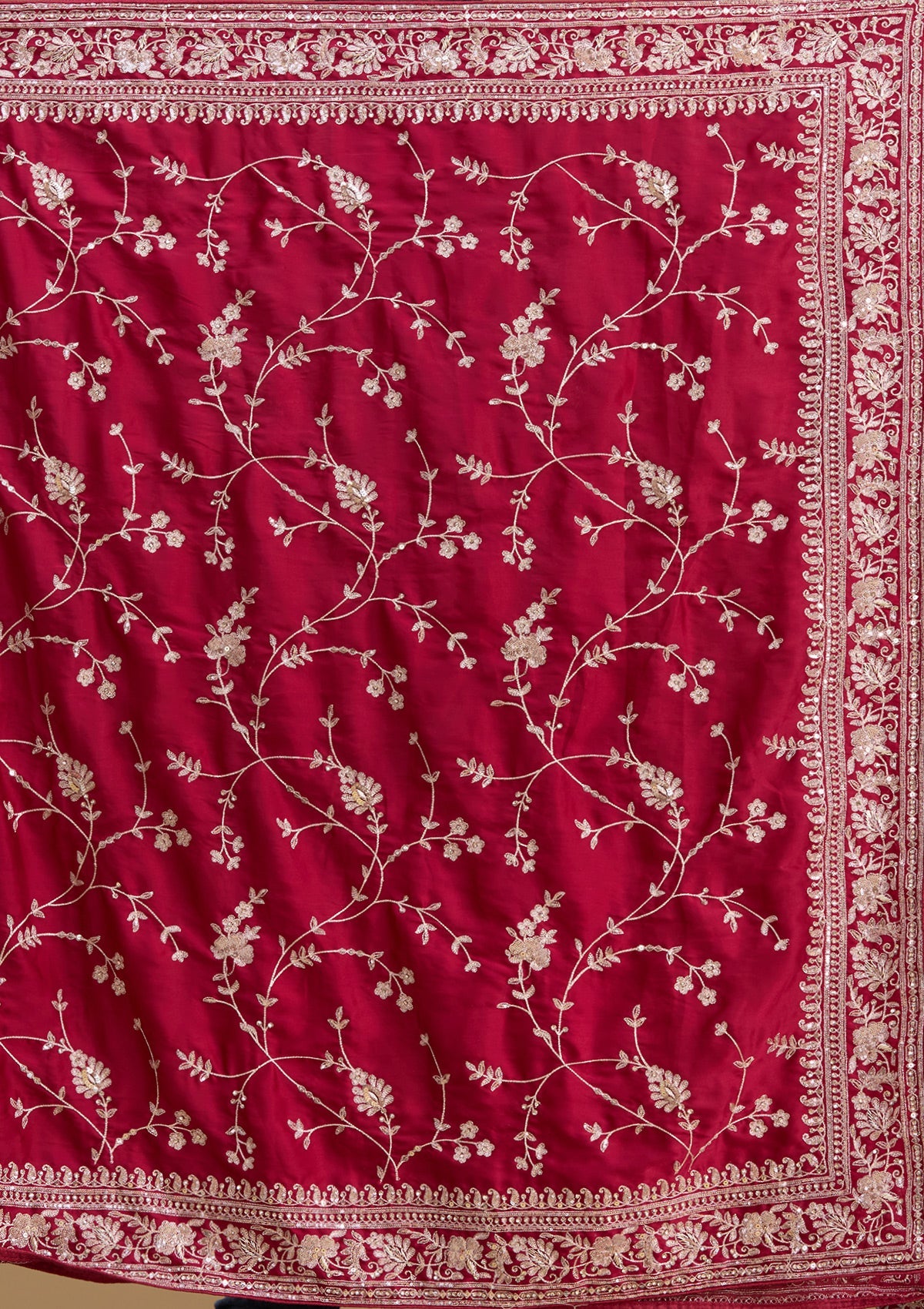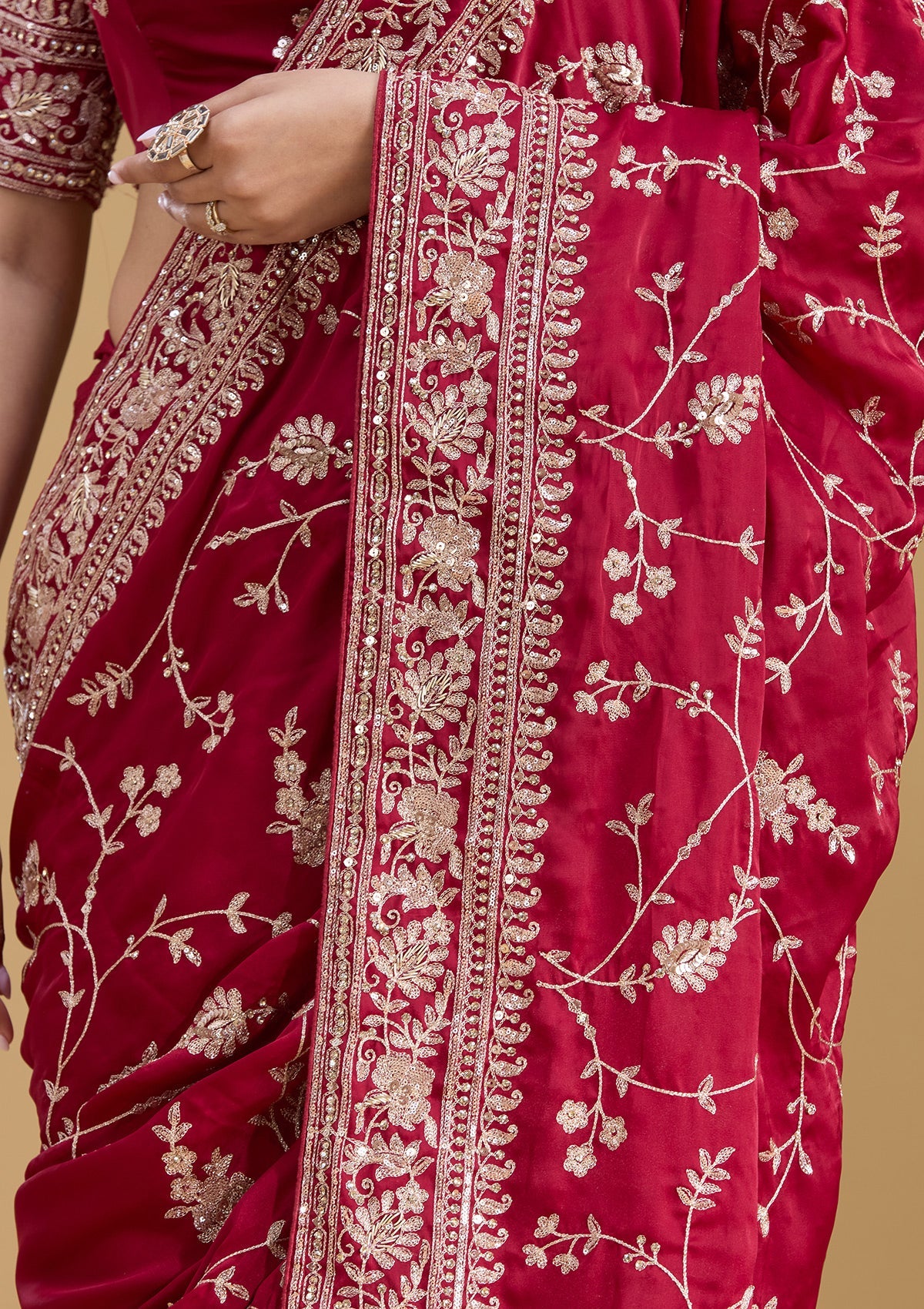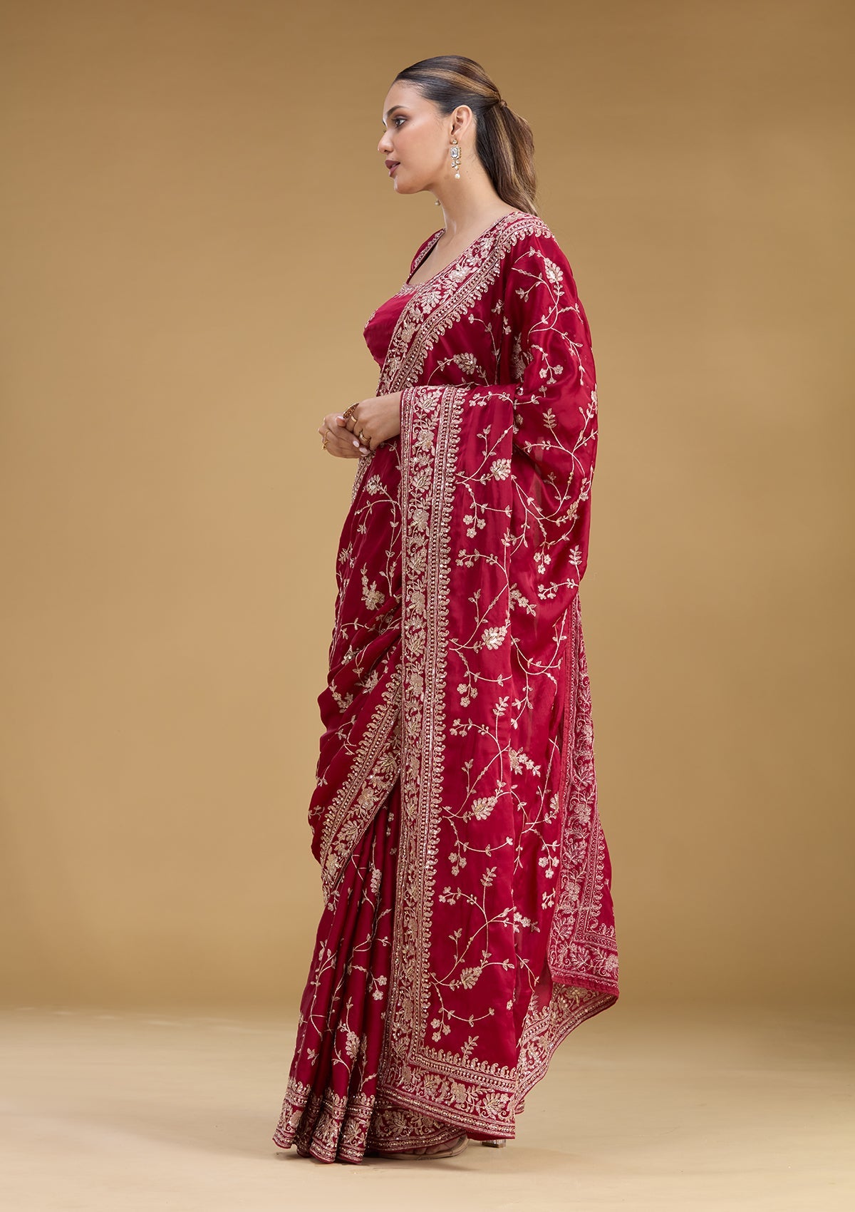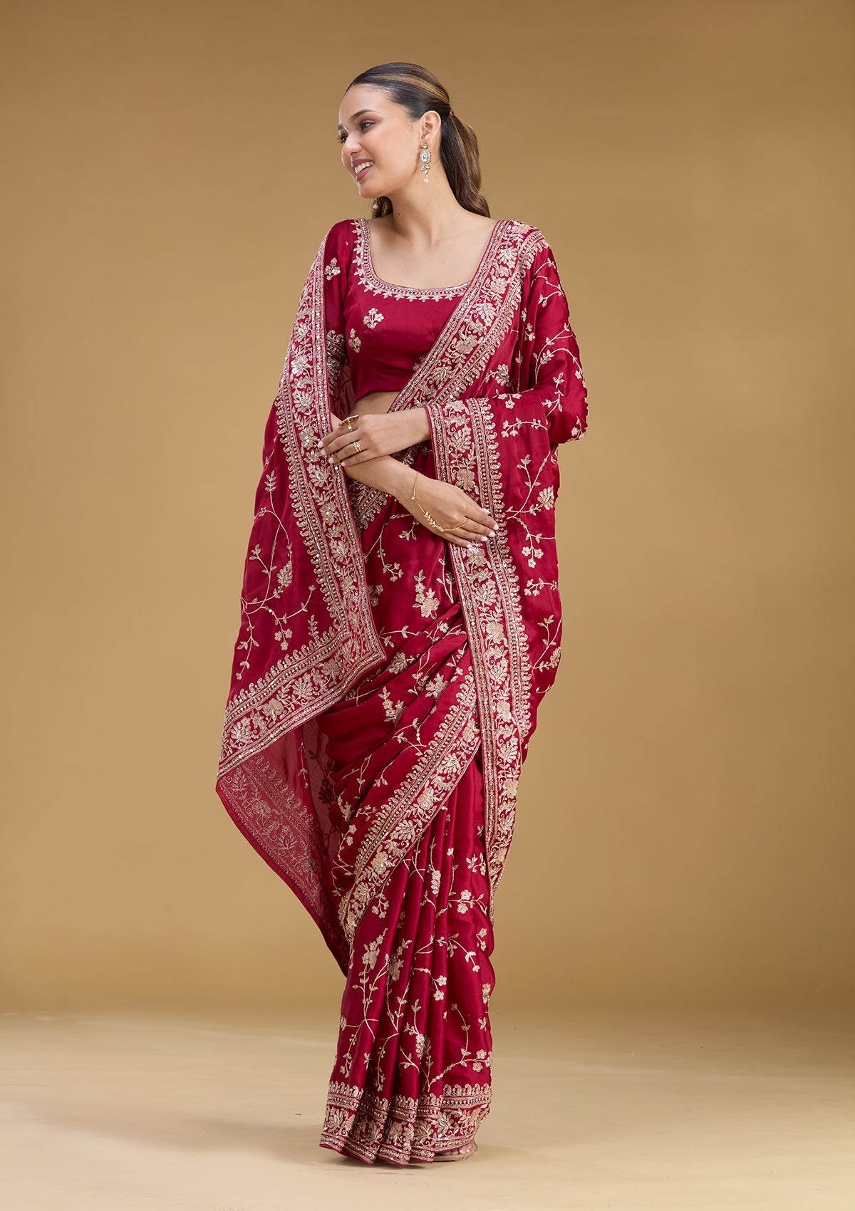Maroon Saree in Satin fabric. The Saree is elevated with Aariwork embroidery. It comes with an Unstitched blouse. Comes with the Koskii promise of premium quality.