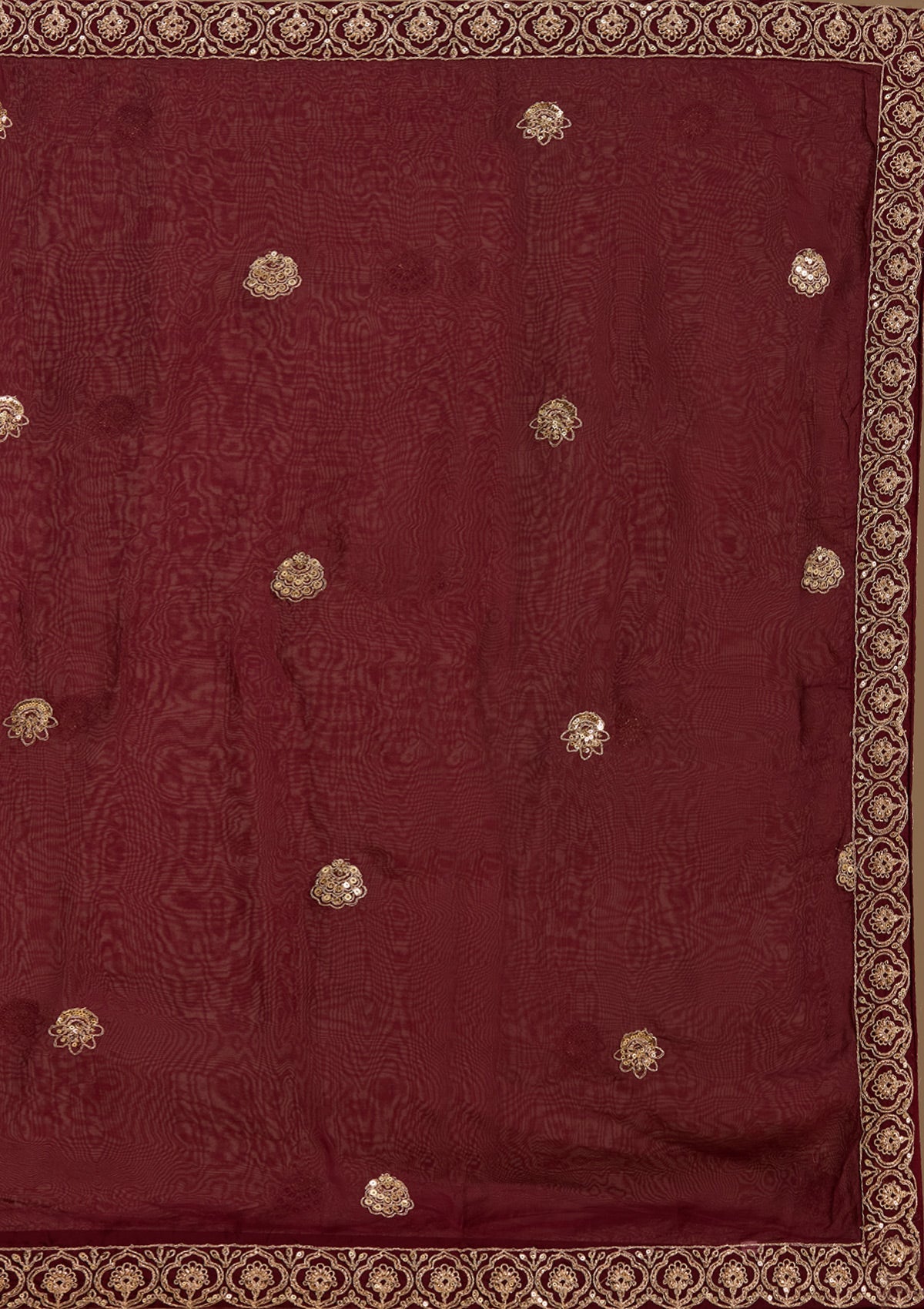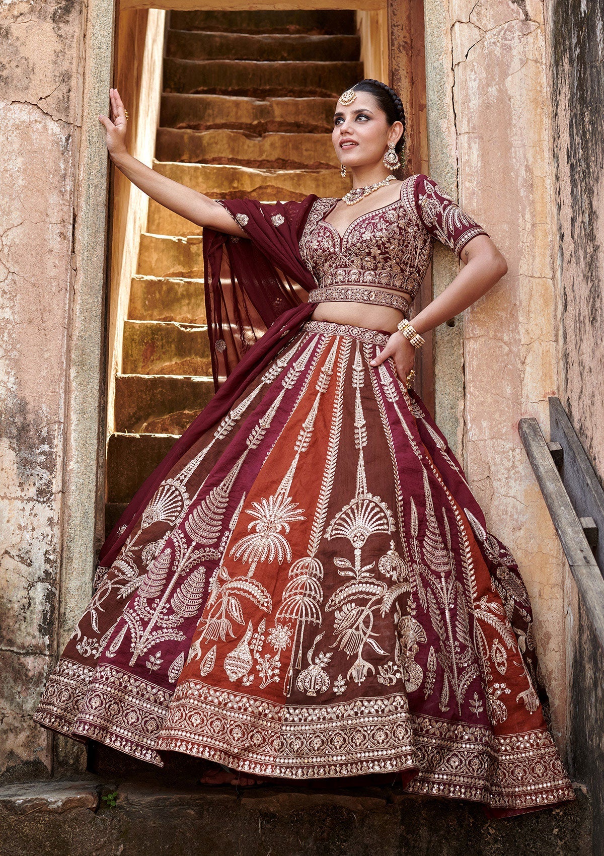 Maroon Readymade Lehenga in Raw Silk fabric The Lehenga is embellished with Cording embroidery Accompanied with an Readymade blouse and dupatta Comes with the Koskii promise of premium quality.