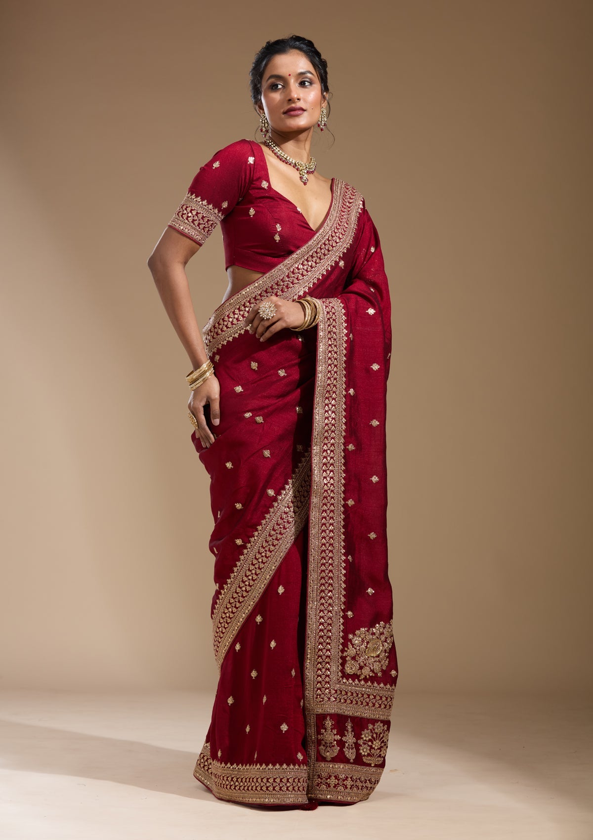 Maroon Saree in Soft Raw Silk fabric. The Saree is elevated with Cording embroidery. It comes with an Unstitched blouse. Comes with the Koskii promise of premium quality.