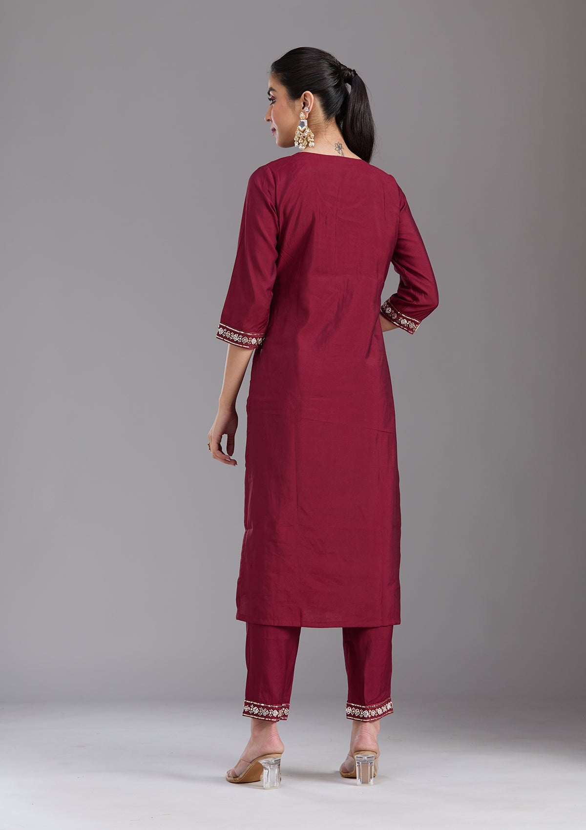 Maroon Salwar Suit in Chanderi fabric. The Salwar Suit is embellished with Cutdana embroidery. Accompanied with a bottom and dupatta. Comes with the Koskii promise of premium quality.