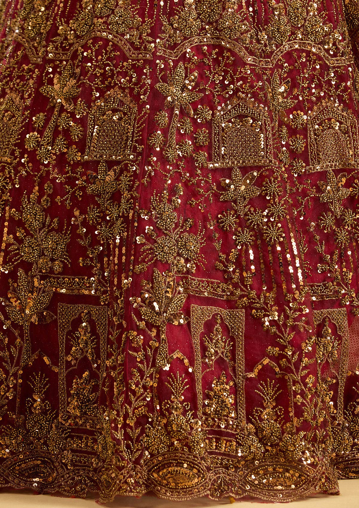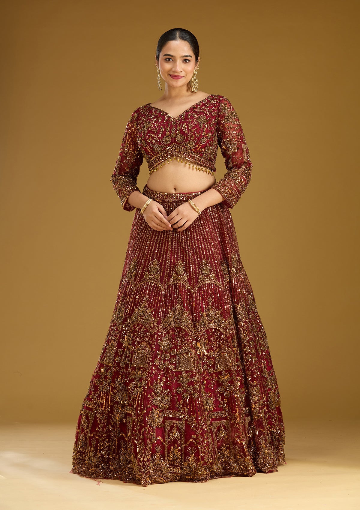 Maroon Readymade Lehenga in Net fabric. The Lehenga is embellished with Cutdana embroidery. Accompanied with an Readymade blouse and dupatta. Comes with the Koskii promise of premium quality.