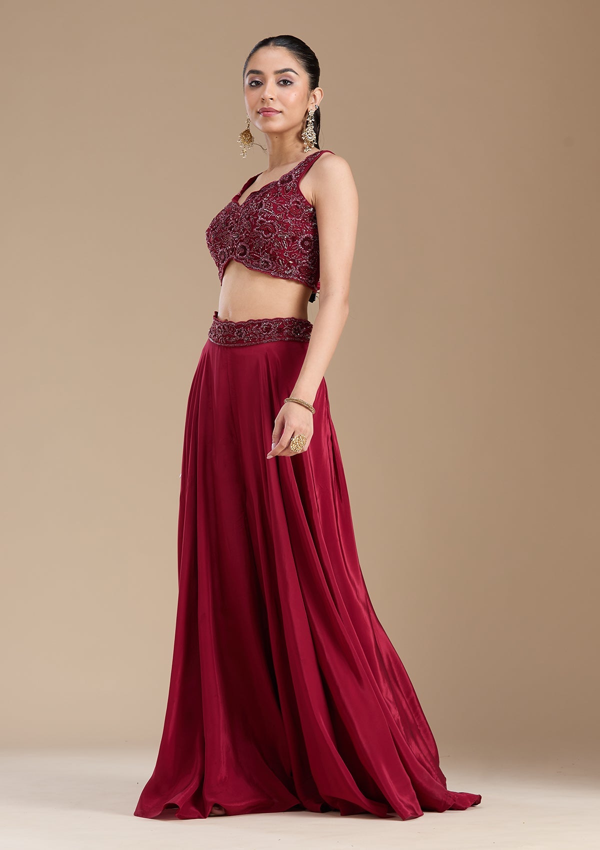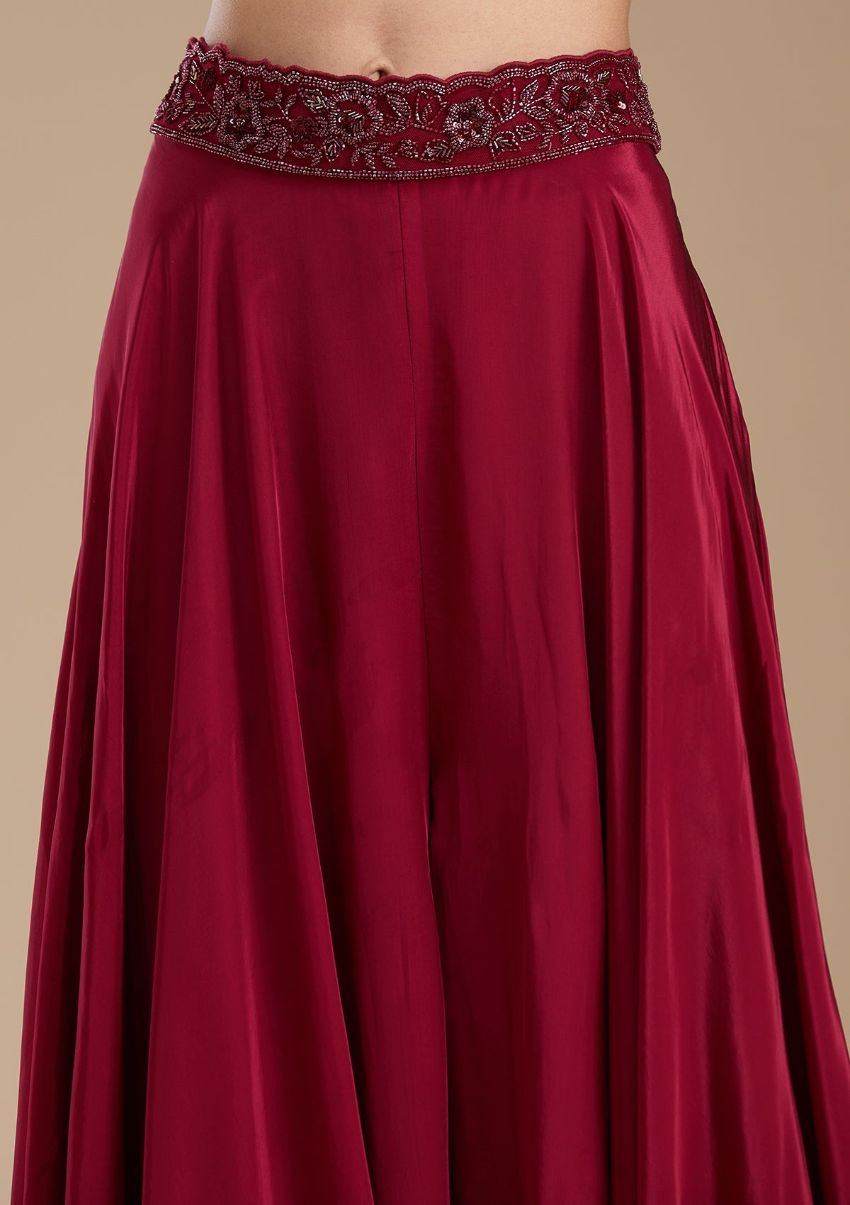 Maroon Salwar Suit in Soft Raw Silk fabric. The Salwar Suit is embellished with Cutdana embroidery. Accompanied with a bottom and dupatta. Comes with the Koskii promise of premium quality.
