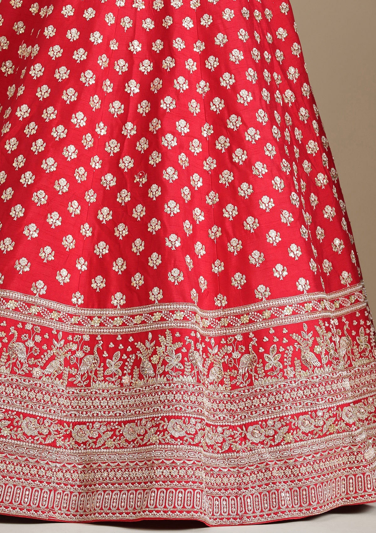 Maroon Readymade Lehenga in Raw Silk fabric. The Lehenga is embellished with Zardozi (Gold) embroidery. Accompanied with an Readymade blouse and dupatta. Comes with the Koskii promise of premium quality.