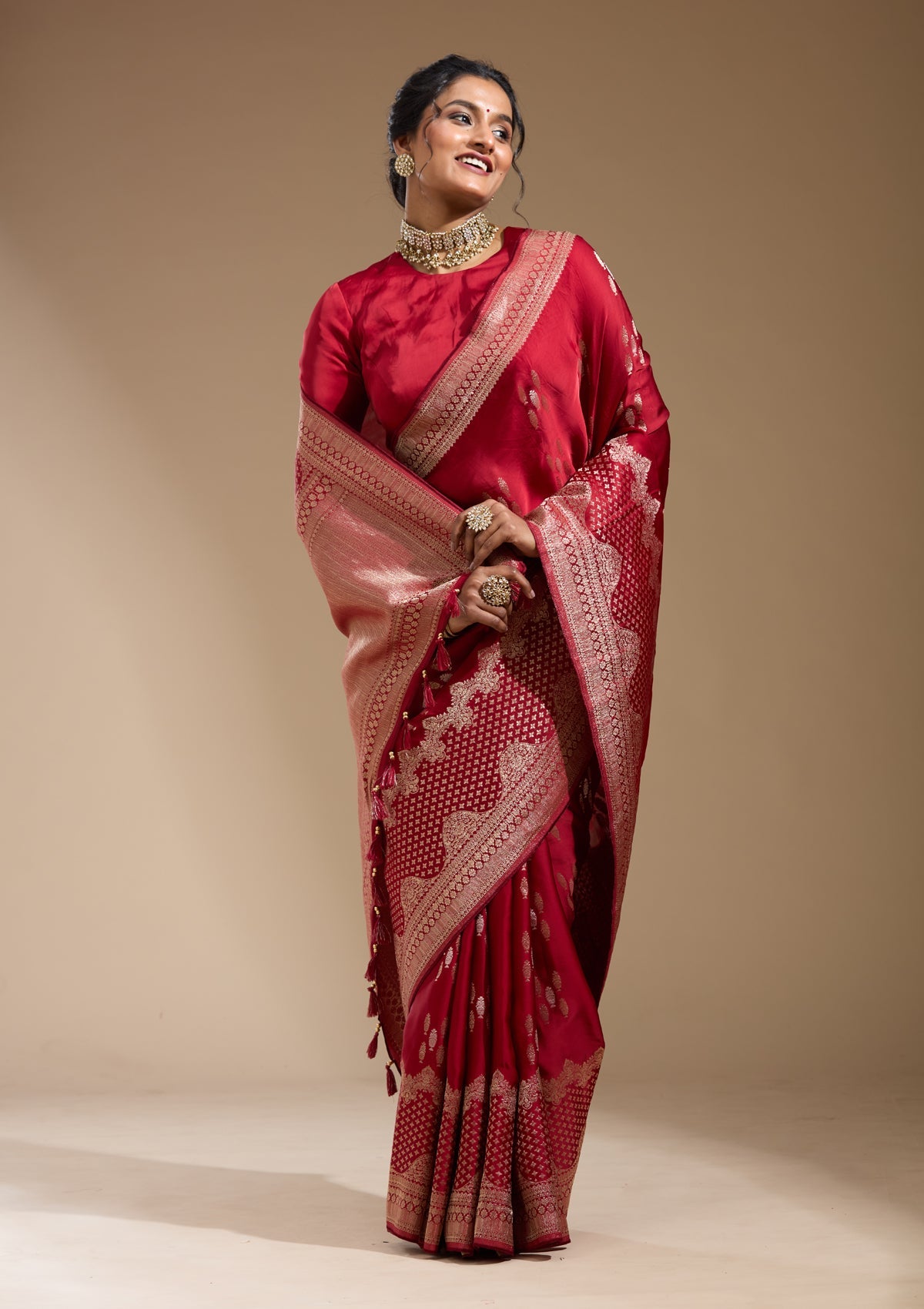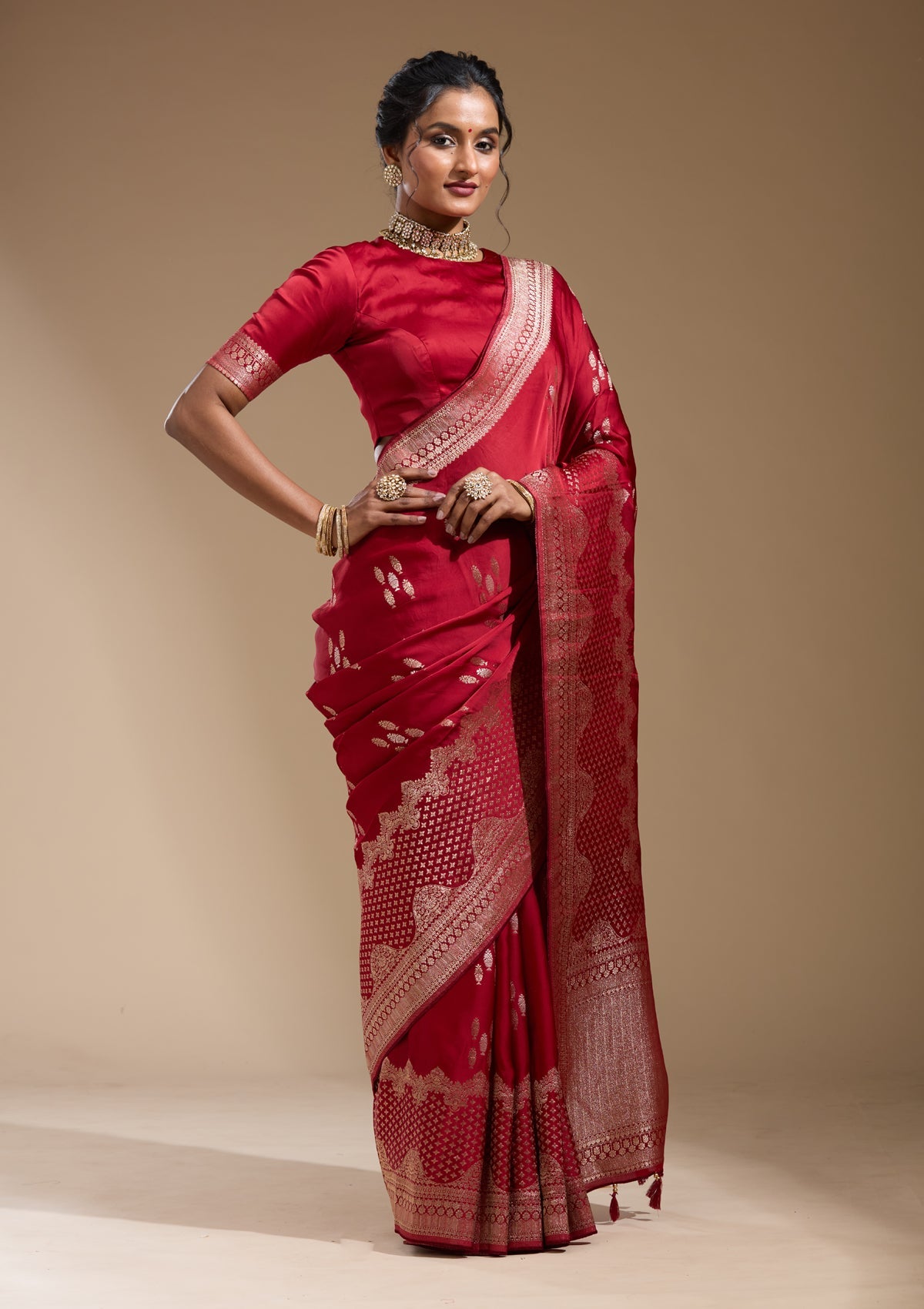 Maroon Silk_Saree in Satin fabric. The Silk_Saree is elevated with Zariwork (Gold) embroidery. It comes with an Unstitched blouse. Comes with the Koskii promise of premium quality.