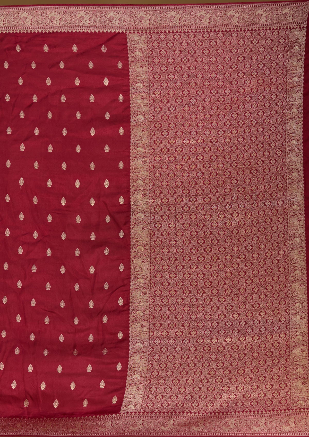 Maroon Silk_Saree in Silk fabric. The Silk_Saree is elevated with Zariwork (Gold) embroidery. It comes with an Unstitched blouse. Comes with the Koskii promise of premium quality.