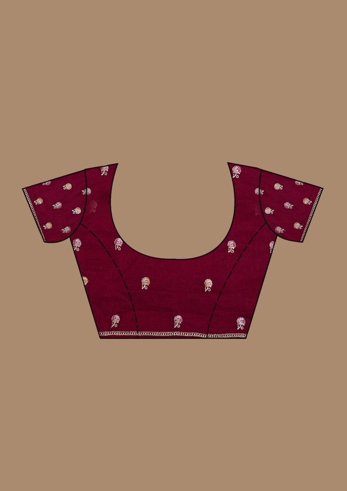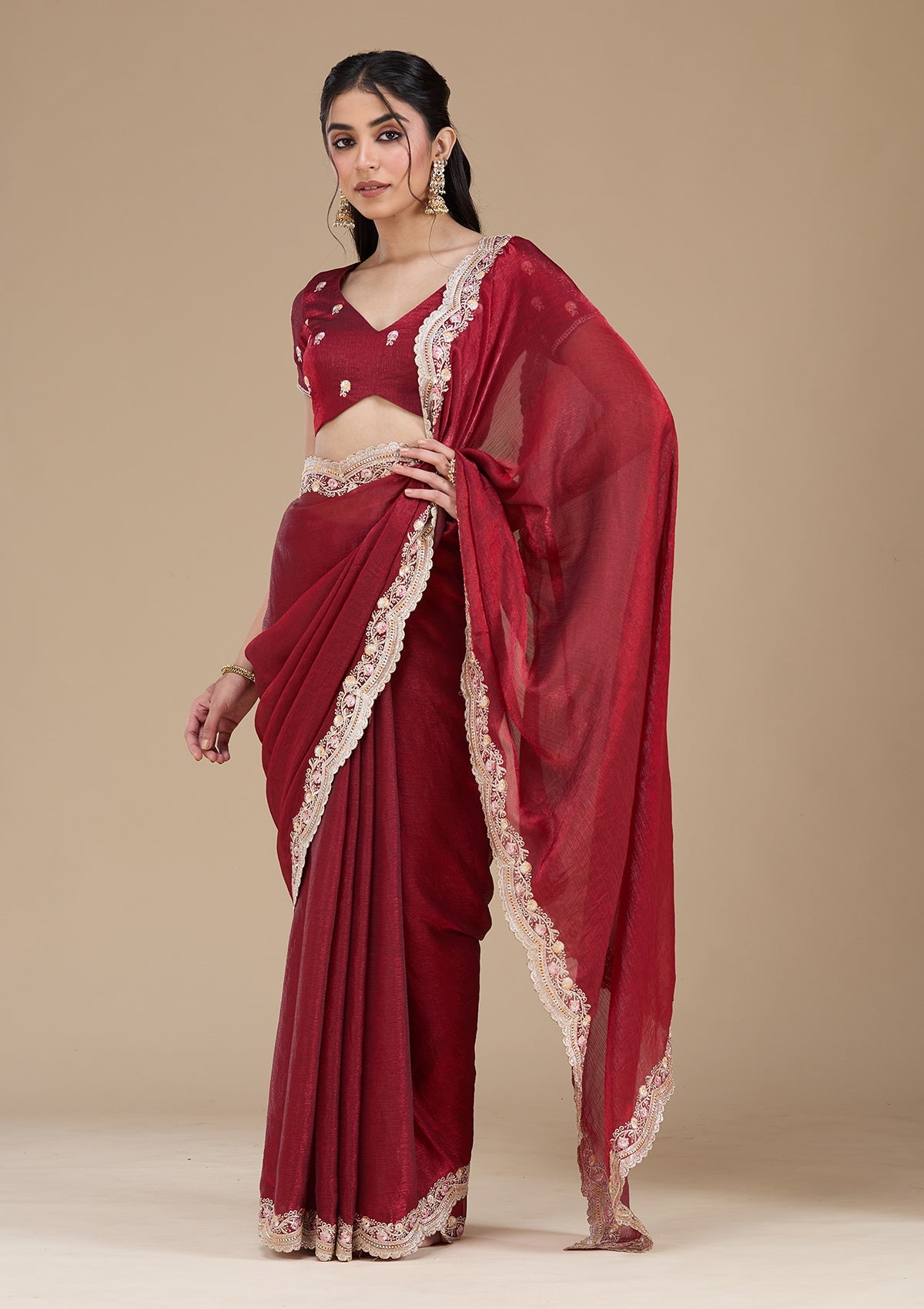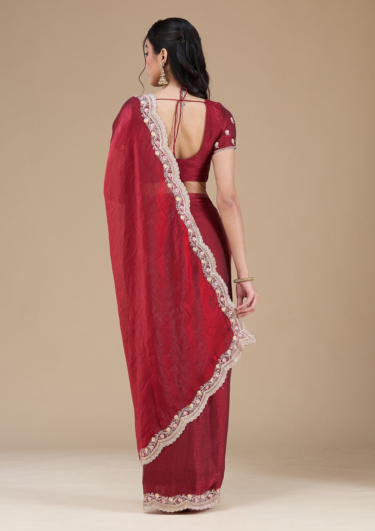 Maroon Saree in Tissue fabric. The Saree is elevated with Zariwork (Gold) embroidery. It comes with an Unstitched blouse. Comes with the Koskii promise of premium quality.