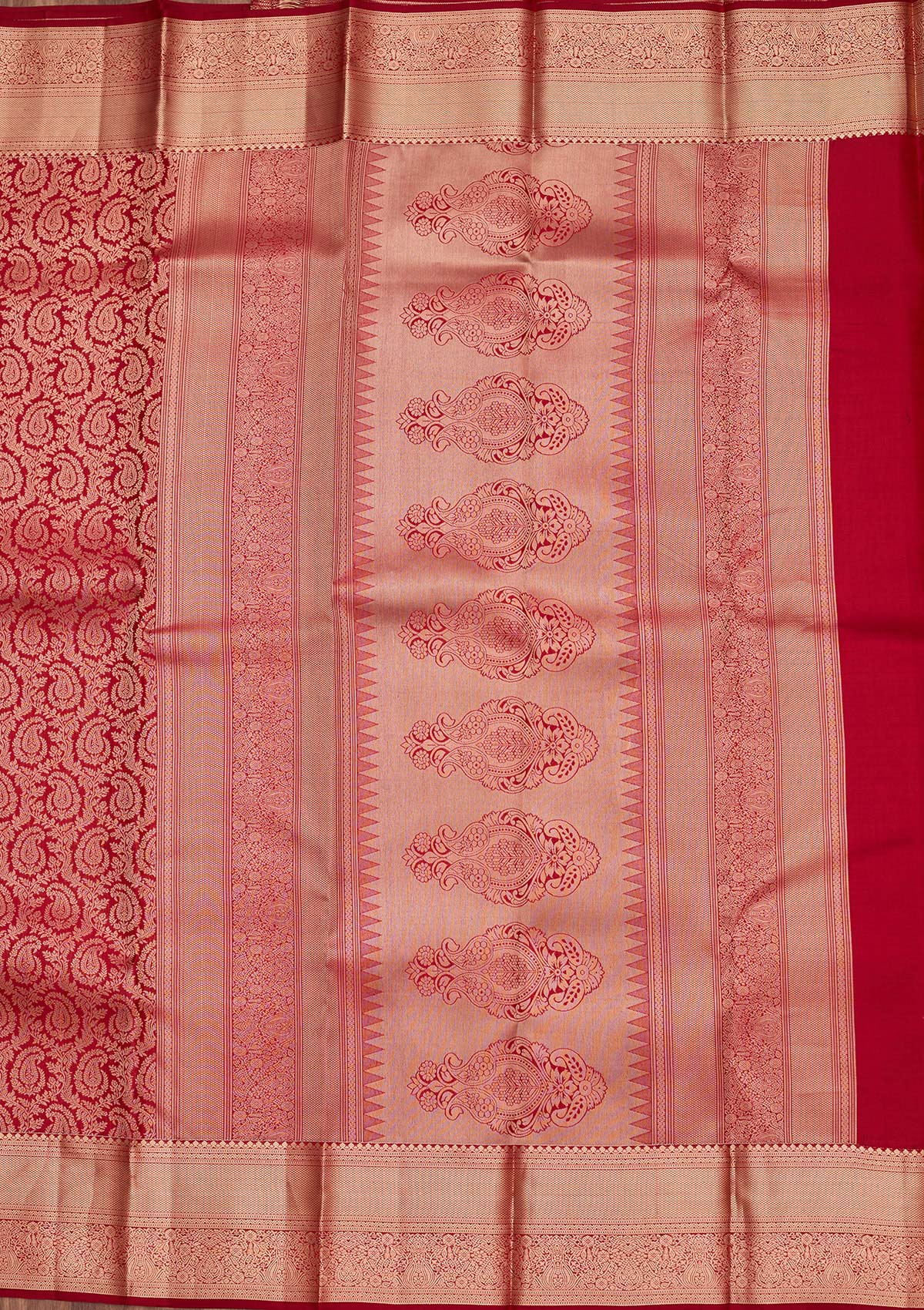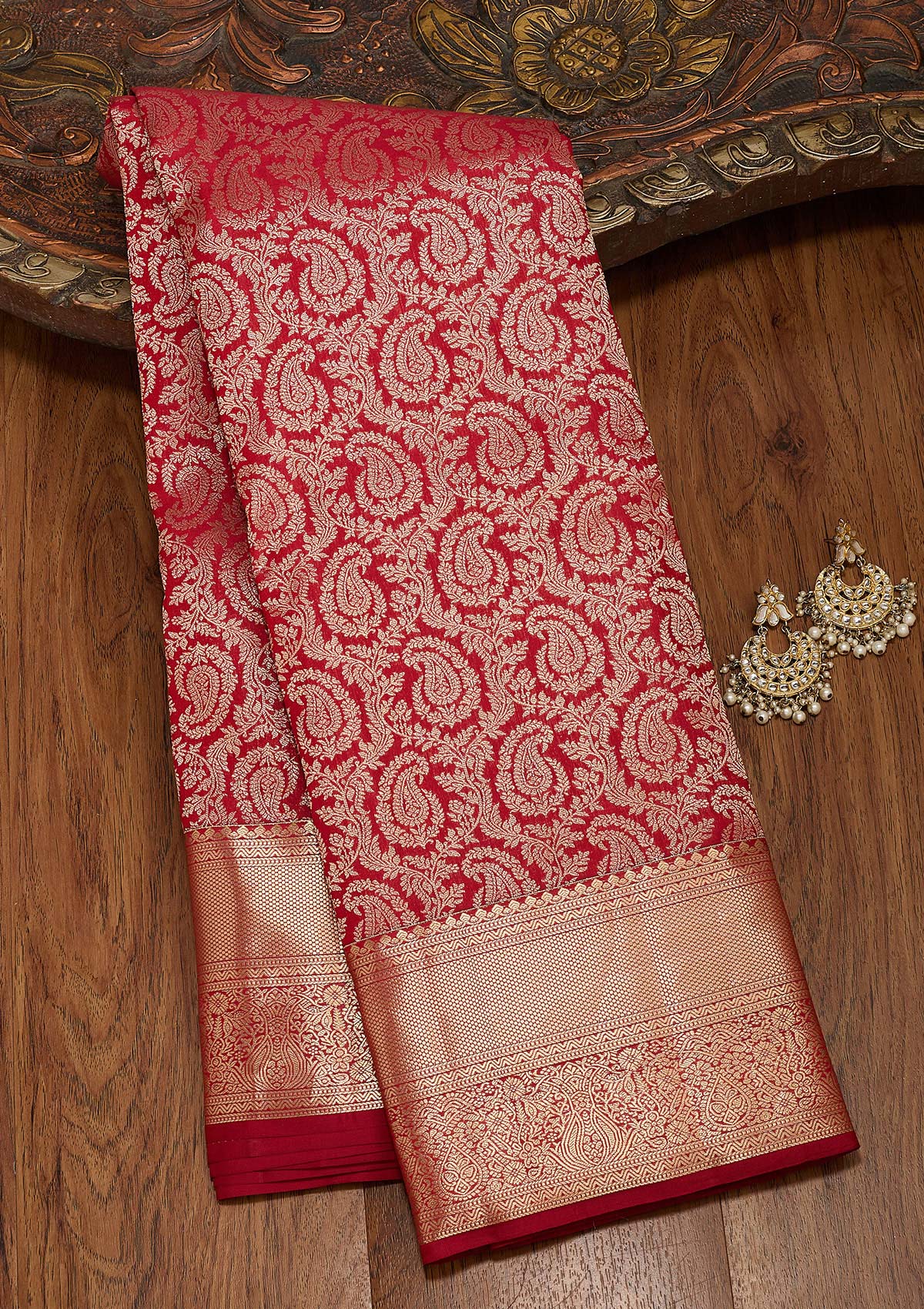 Maroon Silk Saree in Pure Silk fabric The Silk Saree is elevated with Zariwork embroidery It comes with an Unstitched blouse Comes with the Koskii promise of premium quality.