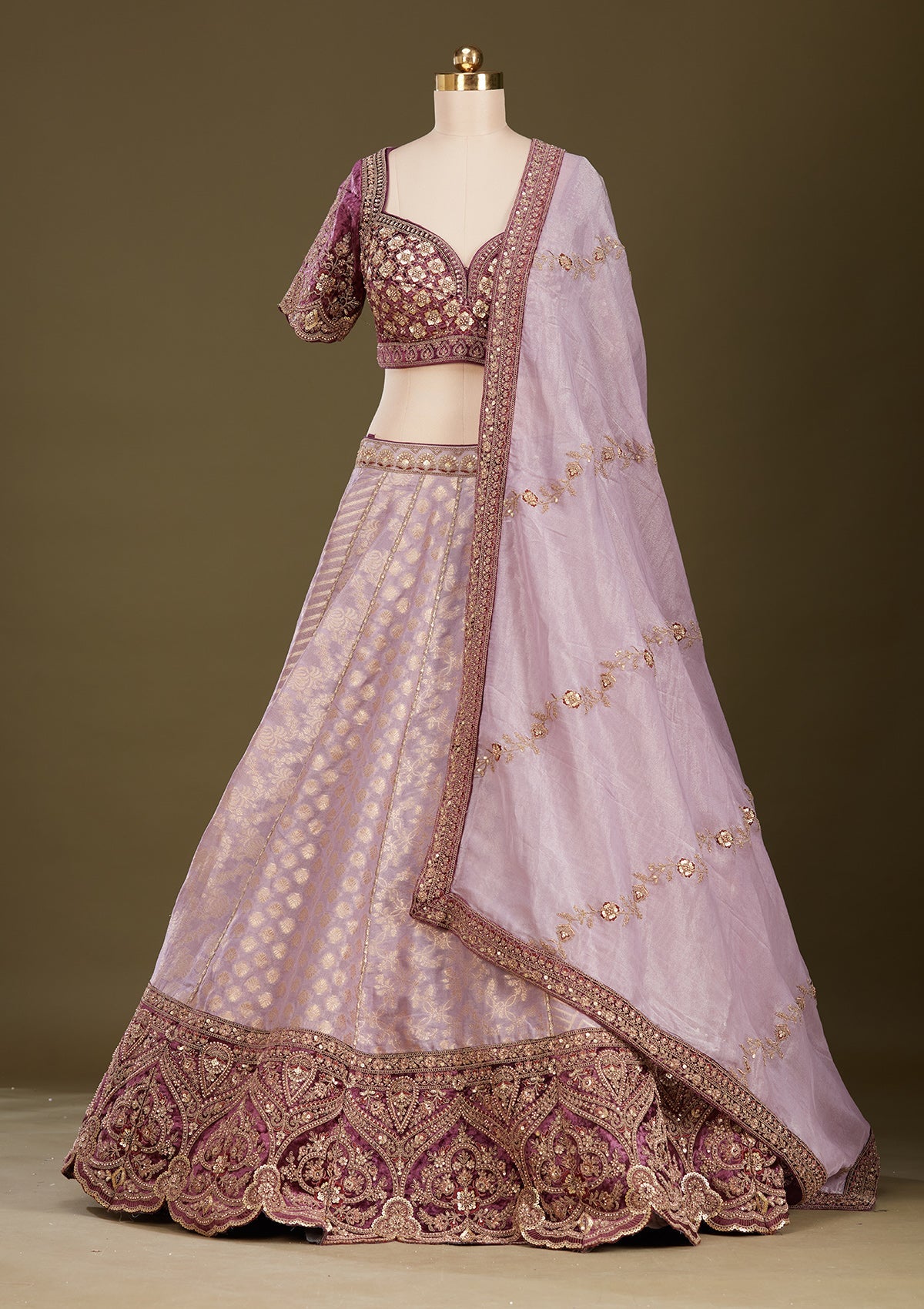 Mauve Readymade Lehenga in Brocade fabric. The Lehenga is embellished with Cording embroidery. Accompanied with an Readymade blouse and dupatta. Comes with the Koskii promise of premium quality.