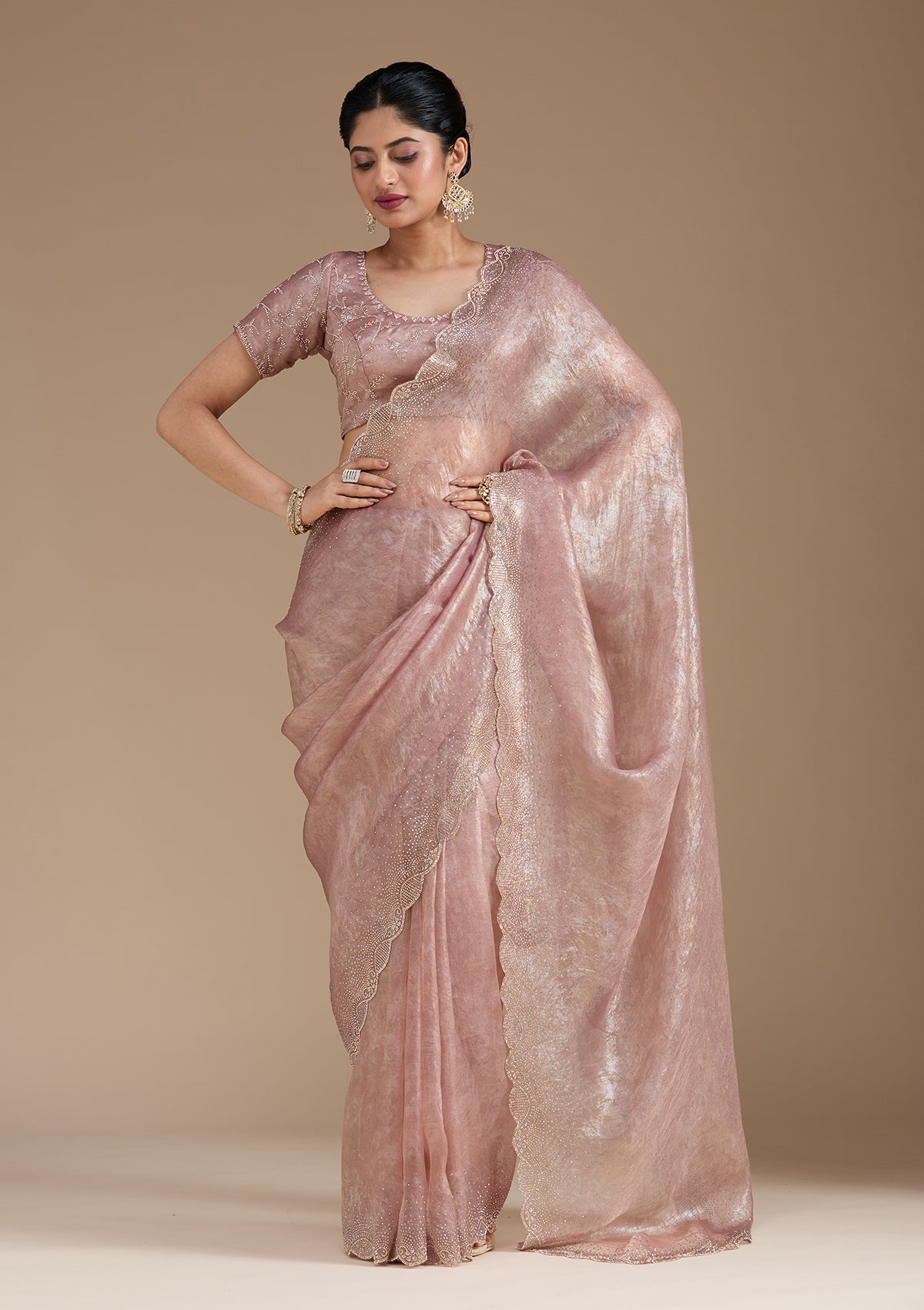 Mauve Saree in Tissue fabric. The Saree is elevated with Stonework (Gold) embroidery. It comes with an Unstitched blouse. Comes with the Koskii promise of premium quality.