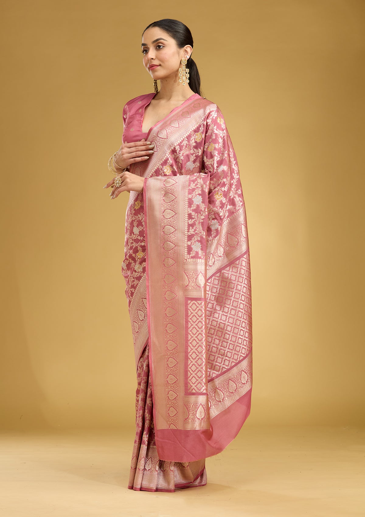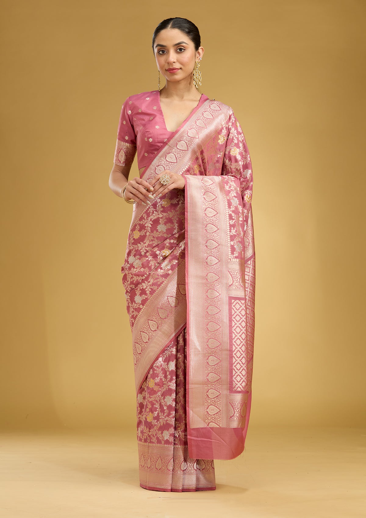 Mauve Silk_Saree in Satin fabric. The Silk_Saree is elevated with Zariwork (Gold) embroidery. It comes with an Unstitched blouse. Comes with the Koskii promise of premium quality.