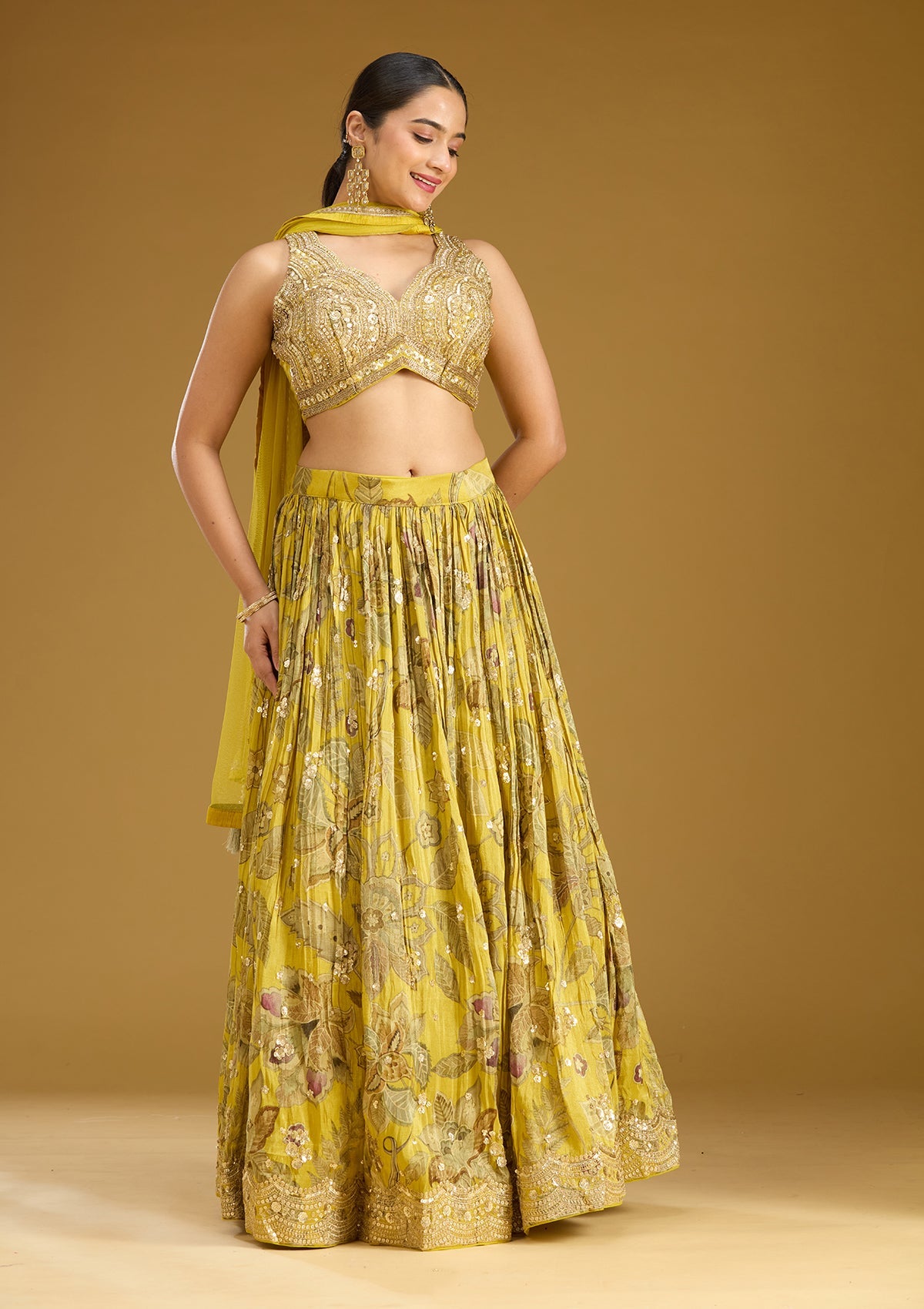 Mehandi Green Readymade Lehenga in Crepe fabric. The Lehenga is embellished with Zariwork (Gold) embroidery. Accompanied with an Readymade blouse and dupatta. Comes with the Koskii promise of premium quality.
