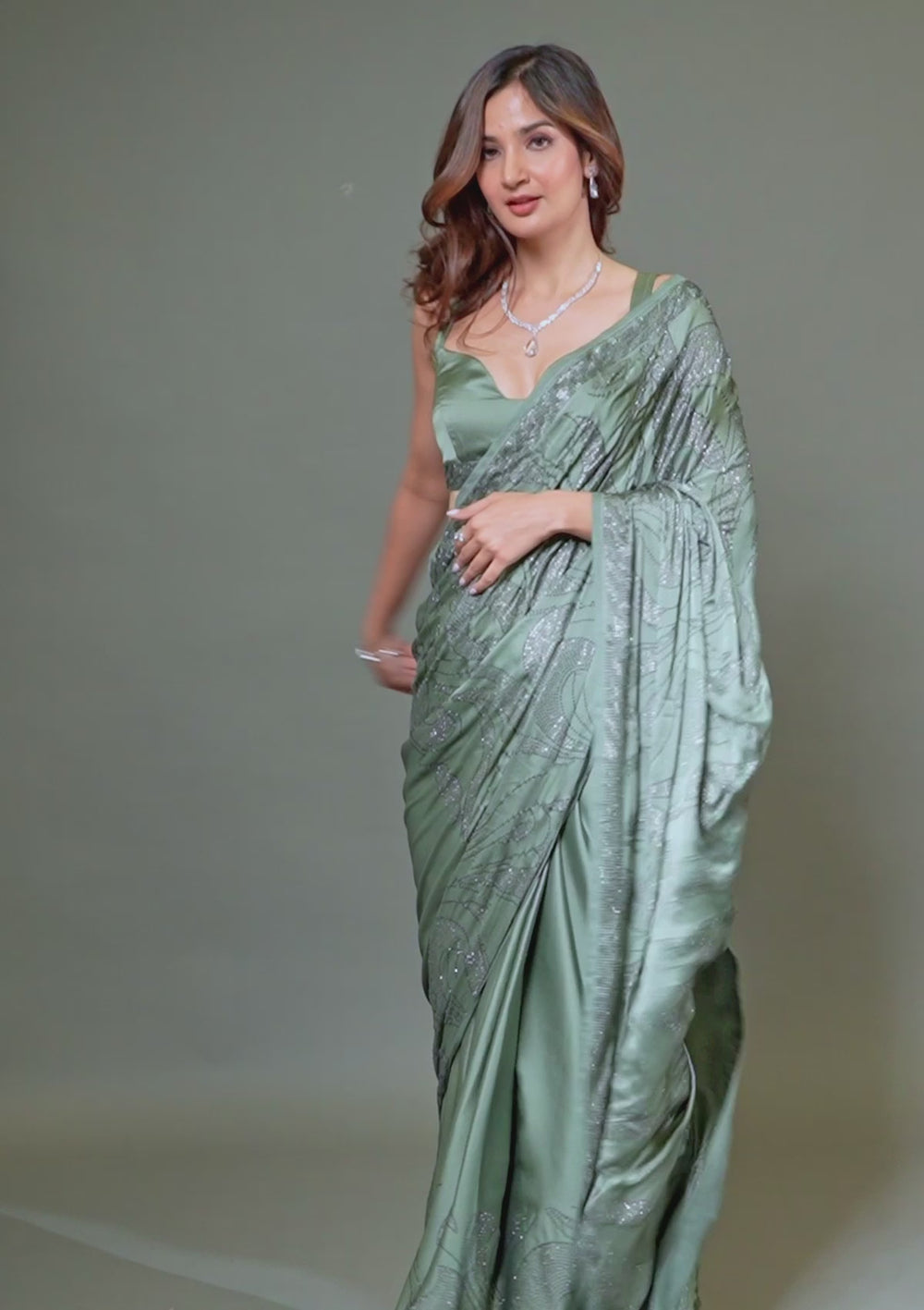 Mehendi Saree in Crepe fabric. The Saree is elevated with Swarovski embroidery. It comes with an Unstitched blouse. Comes with the Koskii promise of premium quality.